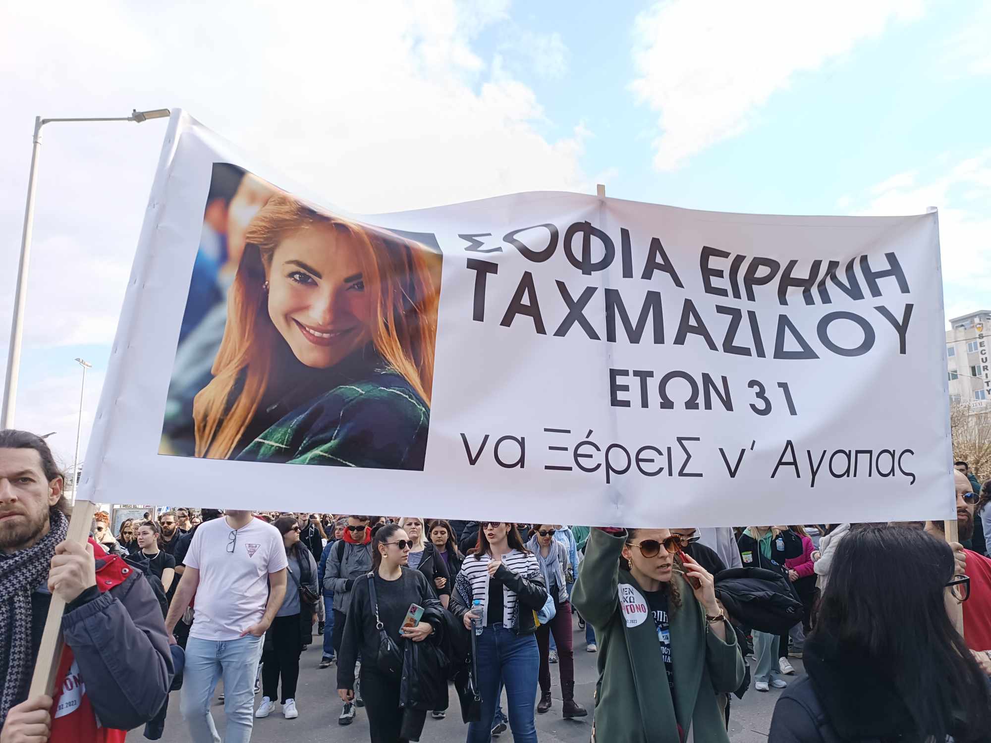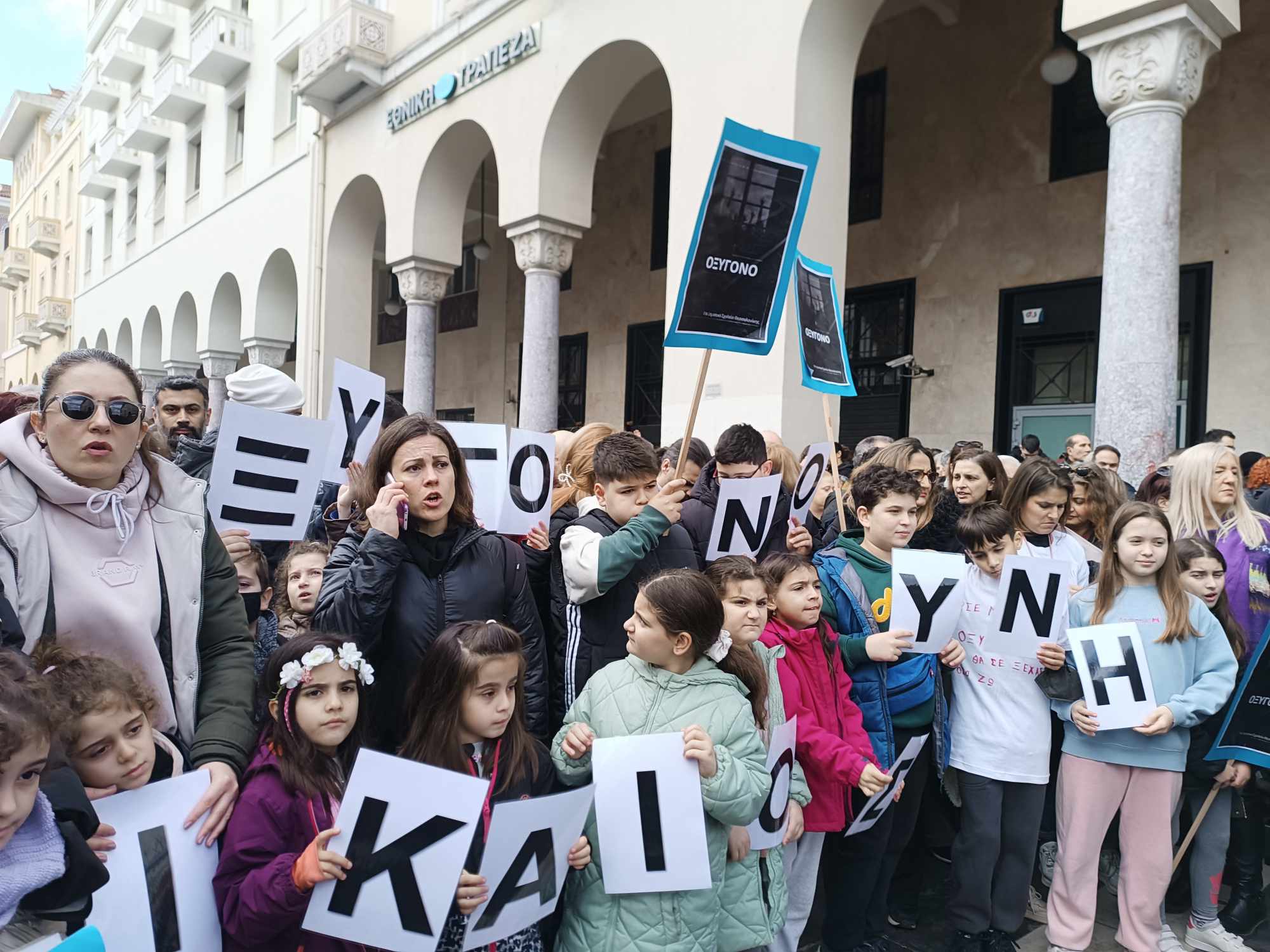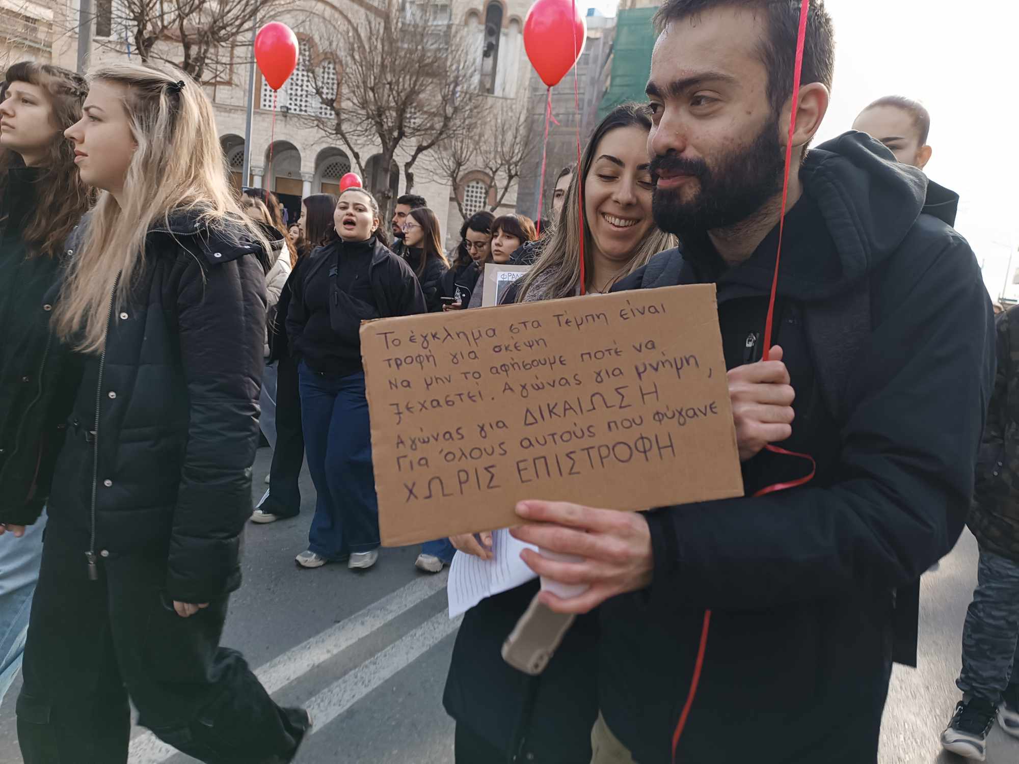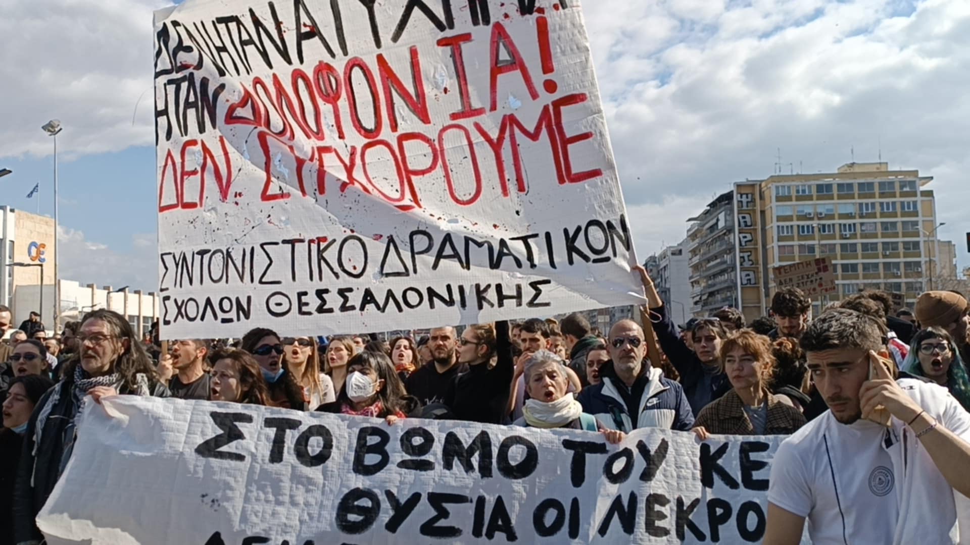Μεγαλειώδες συλλαλητήριο με αίτημα τη δικαίωση των θυμάτων του εγκλήματος των Τεμπών πραγματοποιήθηκε και στη Θεσσαλονίκη στο πλαίσιο της 24ωρης απεργίας των συνδικάτων. Όλες οι κεντρικές αρτηρίες αλλά και τα στενά του κέντρου της πόλης γέμισαν ασφυκτικά ενώ η συγκέντρωση του κόσμου εκτεινόταν από τον ΟΣΕ μέχρι και την Παπάφη. Από νωρίς το πρωί «ποτάμια» ανθρώπων κατέβαιναν προς το άγαλμα Βενιζέλου αλλά και στα σημεία όπου είχαν οριστεί οι προσυγκεντρώσεις των εργατικών σωματείων, των συλλόγων και των πολιτικών οργανώσεων. Επί ώρες ήταν αδύνατο να μετακινηθεί κανείς σε ακτίνα χιλιομέτρων. Εκατοντάδες χιλιάδες άνθρωποι άκουσαν από τα μεγάφωνα τις ομιλίες των συγγενών των θυμάτων και εργαζόμενων στον σιδηρόδρομο ενώ κατά διαστήματα ακούγονταν η λέξη «αθάνατοι». Στις τοποθετήσεις τους μίλησαν για τις συνεχείς απόπειρες συγκάλυψης του εγκλήματος αλλά και των βαθύτερων αιτιών του ενώ παράλληλα ζήτησαν ασφαλείς και δημόσιες μεταφορές. Στα πανό και τα πλακάτ των διαδηλωτών κυριαρχούσαν τα συνθήματα «δεν έχω οξυγόνο», «δικαίωση», «δεν ήταν ατύχημα, ήταν έγκλημα», «όσο χώμα και αν ρίξετε, η αλήθεια δε θάβεται», «η ιδιωτικοποίηση δολοφονεί» «δε συγχωρούμε» ενώ σε πολλά πανό αναγράφονταν τα ονόματα των θυμάτων. Ιδιαίτερα μαζικά ήταν τα μπλοκ των μαθητών-τριών δημόσιων και ιδιωτικών σχολείων όλων των βαθμίδων, των φοιτητών-τριών, των εκπαιδευτικών και των πανεπιστημιακών αλλά και εργατικών σωματείων που απεργούσαν ακόμη και σε κλάδους που παλαιότερα θεωρούνταν αδιανόητο. Εργαζόμενοι-ες σε σουπερμάρκετ, ιδιωτικά θεραπευτήρια, νοσοκοκομειακοί γιατροί, διοικητικοί υπάλληλοι, μισθωτοί, εργαζόμενοι σε εργοστάσια της πόλης. Υπήρχαν, ακόμη, ξεχωριστά πανό και μπλοκ για κάθε ένα από τα θύματα του εγκλήματος των Τεμπών με συγγενείς και φίλους να τα ακολουθούν. Ιδιαίτερος παλμός δόθηκε από τους καλλιτέχνες-ιδες των δραματικών σχολών αλλά και από όλο εκείνο το πλήθος που φώναζε «δολοφόνοι». «Όταν ένα παιδί λέει δεν έχω οξυγόνο, αυτό είναι που κάνει το κράτος δολοφόνο». Το «παρών» έδωσαν με μαζικά μπλοκ οπαδοί αθλητικών ομάδων της πόλης αλλά και μέλη της Ρομά κοινότητας που εξέφραζαν την οργή τους για τις δολοφονίες συνανθρώπων τους. Οι διαδηλωτές μίλησαν και για τα υπόλοιπα «Τέμπη» που έχουν συμβεί στη χώρα με θύματα μετανάστες και προσφύγισσες, όπως στο ναυάγιο στην Πύλο κάνοντας λόγο για «κράτος δολοφόνο». Μετά το προσκλητήριο νεκρών στο άγαλμα Βενιζέλου πραγματοποιήθηκε διαδήλωση μέχρι τον ΟΣΕ, όπου για πάνω από 2 ώρες υπήρχε συνεχής ροή από κόσμο που περνούσε και περικύκλωνε τον σταθμό των τρένων. Η διαδρομή συνεχίστηκε από την Αγ. Πάντων προς το ΥΜΑΘ όπου και ολοκληρώθηκε η κινητοποίηση, ενώ μικρής έντασης επεισόδια συνέβησαν μπροστά στον ΟΣΕ εξαιτίας της προκλητικής παρουσίας ανδρών των ΜΑΤ, καθώς και στην Αγ. Δημητρίου, όπου οι διαδηλωτές αποδοκίμαζαν την παρουσία της αστυνομίας.