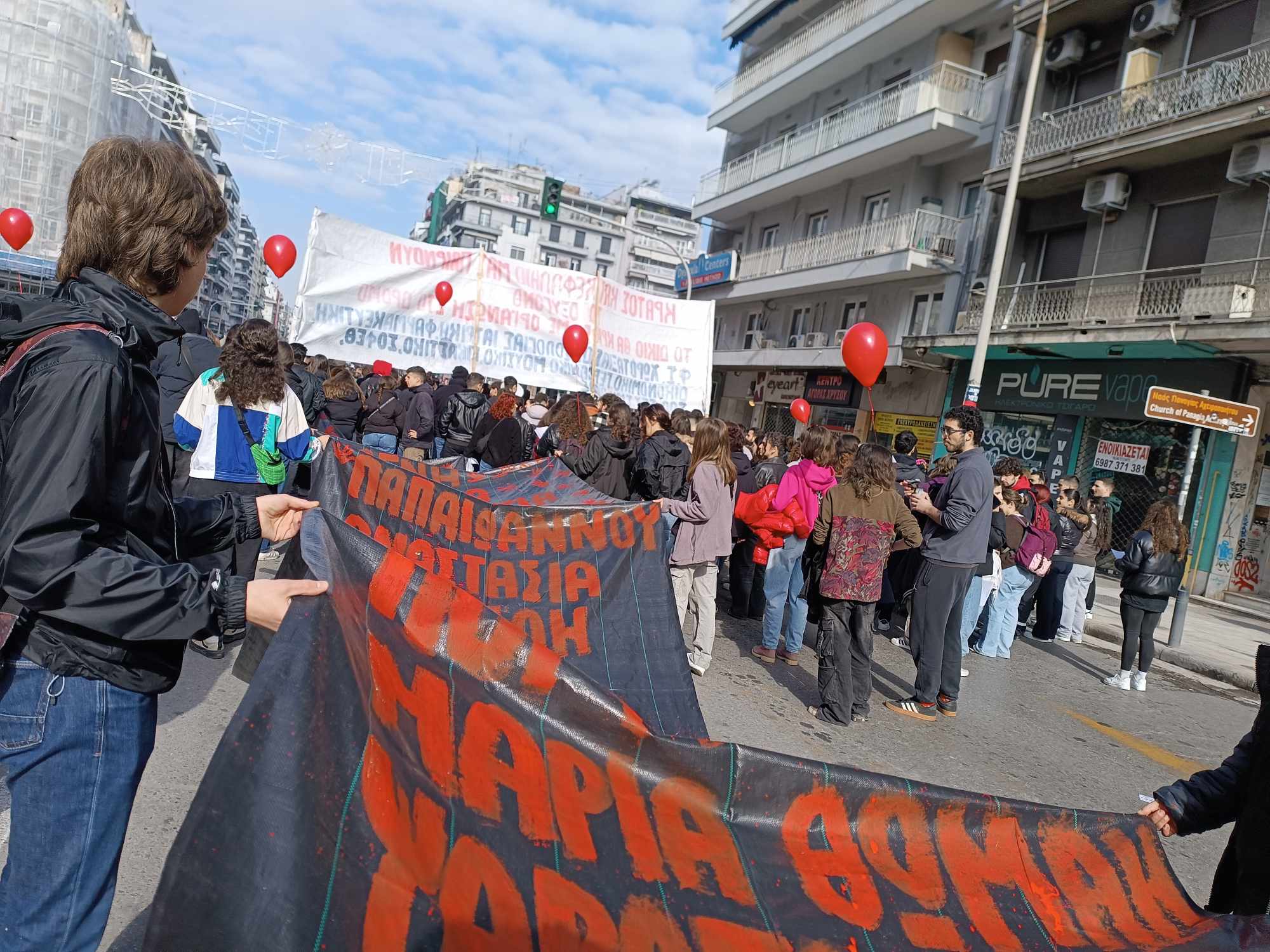 UPD 12:26: Η κεφαλή της πορείας έχει φτάσει στον Σιδηροδρομικό Σταθμό, ενώ το τέλος της είναι στο ύψος της Καμάρας. Ο κόσμος χειροκροτά και τραγουδά το «Πότε θα κάμει ξαστεριά».