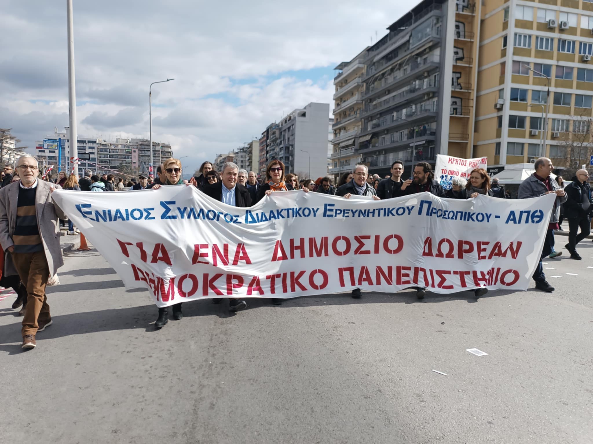 UPD 14:23: Μεγάλο το μπλοκ των πανεπιστημιακών του ΑΠΘ, φτάνει στον ΟΣΕ. Το Αριστοτέλειο Πανεπιστήμιο πλήρωσε μεγάλο «φόρο αίματος», καθώς 16 από τα 57 θύματα ήταν φοιτητές και φοιτήτριες του ιδρύματος. Μαζί φτάνουν τα μπλοκ των συνδικαλιστικών οργανώσεων εκπαιδευτικών.
