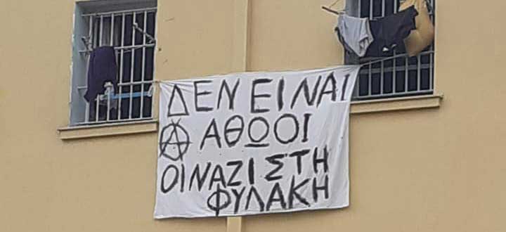 «Ο κρατούμενος Βασίλης Δημάκης διώχθηκε πειθαρχικά για την κατοχή ενός πολιτικού πανώ που έφτιαξε και ανάρτησε στη Δ’ Πτέρυγα των φυλακών Κορυδαλλού την προηγουμένη της έκδοσης της απόφασης της δίκης της ΧΑ με σύνθημα: “Δεν είναι αθώοι @ Οι ναζί στη φυλακή”. Στο πειθαρχικό συμβούλιο που συνεδρίασε σήμερα, ο Βασίλης υπερασπίστηκε θαρραλέα την πράξη του και το φρόνημά του, πήρε πάνω του όλη την ευθύνη απαλλάσσοντας άλλους κρατούμενους από οποιοδήποτε πειθαρχικό παράπτωμα και δήλωσε πως αν και φυλακισμένος διατηρεί την ελευθερία σκέψης και έκφρασης.