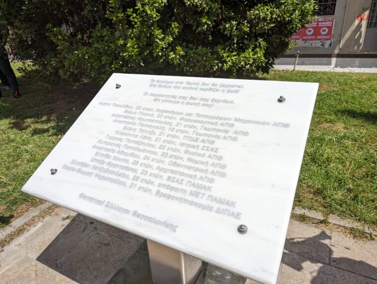 Στα αποκαλυπτήρια του μνημείου που είναι αφιερωμένο στους φοιτητές και τις φοιτήτριες των τριών πανεπιστημίων της Θεσσαλονίκης που έχασαν τη ζωή τους στο σιδηροδρομικό δυστύχημα στα Τέμπη προχώρησαν τα μέλη των Φοιτητικών Συλλόγων του ΑΠΘ.