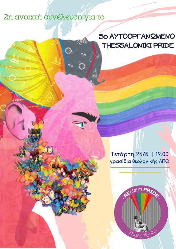 Η δεύτερη ανοιχτή σε άτομα και ομάδες συνέλευση για την προετοιμασία του 5ου Αυτοοργανωμένου Thessaloniki Pride θα πραγματοποιηθεί την Τετάρτη 26/5 στις 19:00 στα Γρασίδια Θεολογικής Α.Π.Θ.