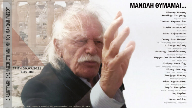 Διαδικτυακή εκδήλωση στη μνήμη του Μανώλη Γλέζου που έφυγε από τη ζωή πριν έναν χρόνο διοργανώνουν συγγραφείς, συνεργάτες-τριες, πανεπιστημιακοί, ιστορικοί, καλλιτέχνες και φίλοι-ες του με τη συμμετοχή ευρωβουλευτών τονίζοντας ότι εξαιτίας των προληπτικών μέτρων για την πανδημία δεν δόθηκε η ευκαιρία συλλογικού αποχαιρετισμού τότε αλλά ούτε μιας ανοιχτής εκδήλωσης σήμερα.