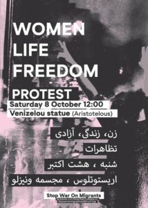 Η «Stop War on Migrants» υπενθυμίζει πως στις 13/9 η 22χρονη Μαχσά Αμινί έπεσε σε κώμα μετά τα χτυπήματα που δέχθηκε από την αστυνομία ηθών, αφού συνελήφθη νωρίτερα στην Τεχεράνη διότι εξείχαν τούφες από τα μαλλιά της, πίσω από το χιτζάμπ της. Τρεις μέρες αργότερα επιβεβαιώθηκε ο θάνατός της. Την ημέρα της κηδείας της ξεκίνησαν οι πρώτες διαδηλώσεις και ξέσπασαν οι πρώτες συγκρούσεις. Λίγο αργότερα, ολόκληρο το Ιράν κατακλύστηκε από ένα τεράστιο κύμα πορειών, οι πρώτες στιγμές μιας εξέγερσης που ακολούθησε.