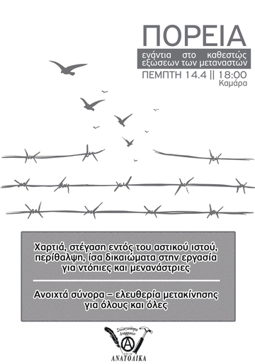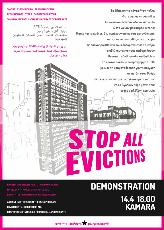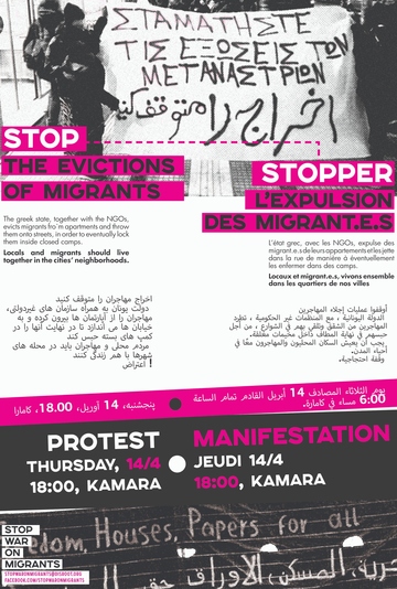 Διαδήλωση ενάντια στις εξώσεις μεταναστ(ρι)ών θα πραγματοποιηθεί σήμερα, Πέμπτη 14 Απριλίου, στις 18.00 με σημείο συγκέντρωσης την Καμάρα. Όπως αναφέρει η συνέλευση stop war on migrants «τα τελευταία δύο χρόνια συμβαίνει ένα μαζικό κύμα εξώσεων των μεταναστριών από τα σπίτια τους, μέσω θεσμικών και εξωθεσμικών πιέσεων και εκβιασμών, πρώτα και κύρια από τις εμπλεκόμενες ΜΚΟ ενάντια στις μετανάστριες, με προφανές αποτέλεσμα την αστεγία για πολλές μετανάστριες και την περεταίρω υποτίμηση, εξαθλίωση της ζωής τους» ενώ διεκδικεί χαρτιά, στέγαση εντός του αστικού ιστού, περίθαλψη, ίσα δικαιώματα στην εργασία για ντόπιες και μενανάστριες και ανοιχτά σύνορα – ελευθερία μετακίνησης.