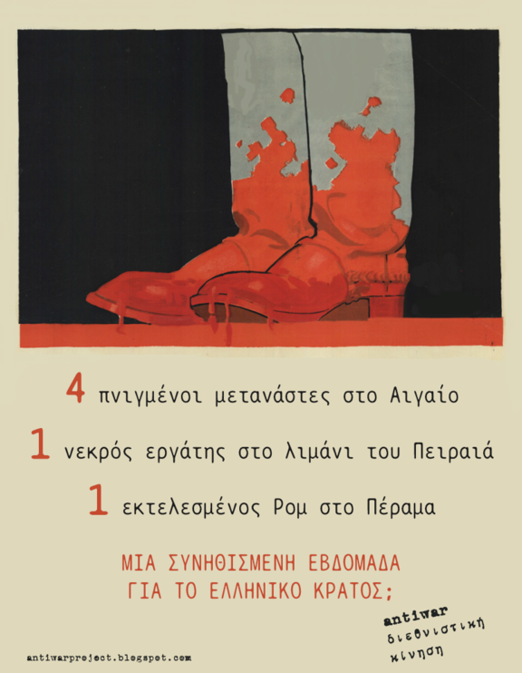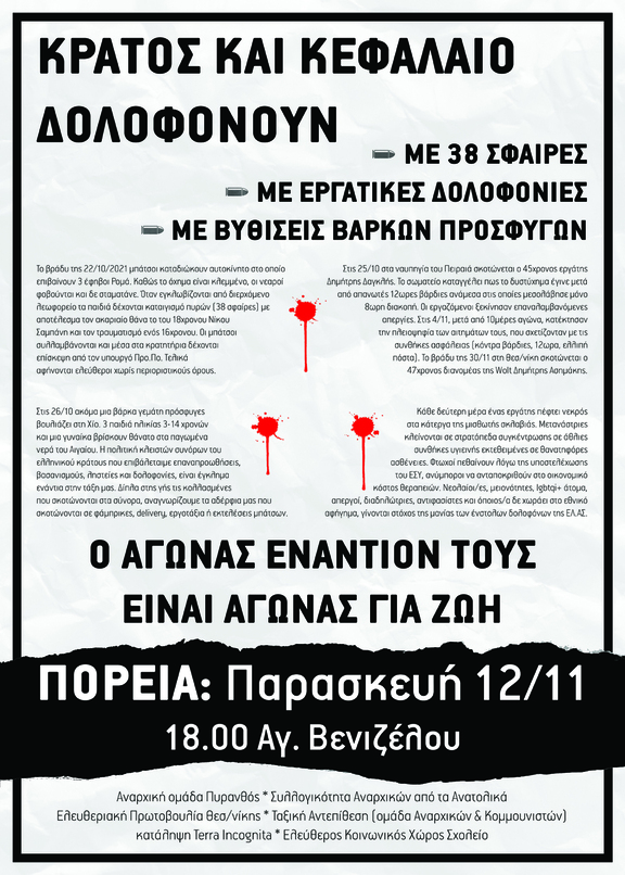 Κάθε δεύτερη μέρα ένας εργάτης πέφτει νεκρός στα κάτεργα της μισθωτής σκλαβιάς. Μετανάστριες κλείνονται σε στρατόπεδα συγκέντρωσης σε άθλιες συνθήκες υγιεινής εκτεθειμένες σε θανατηφόρες ασθένειες. Φτωχοί πεθαίνουν λόγω της υποστελέχωσης του ΕΣΥ, ανήμποροι να ανταποκριθούν στο οικονομικό κόστος θεραπειών. Νεολαίοι/ες, μειονότητες, lgbtqi+ άτομα, απεργοί, διαδηλώτριες, αντιφασίστες και όποιος/α δε χωράει στο εθνικό αφήγημα, γίνονται στόχος της μανίας των ένστολων δολοφόνων της ΕΛ.ΑΣ».