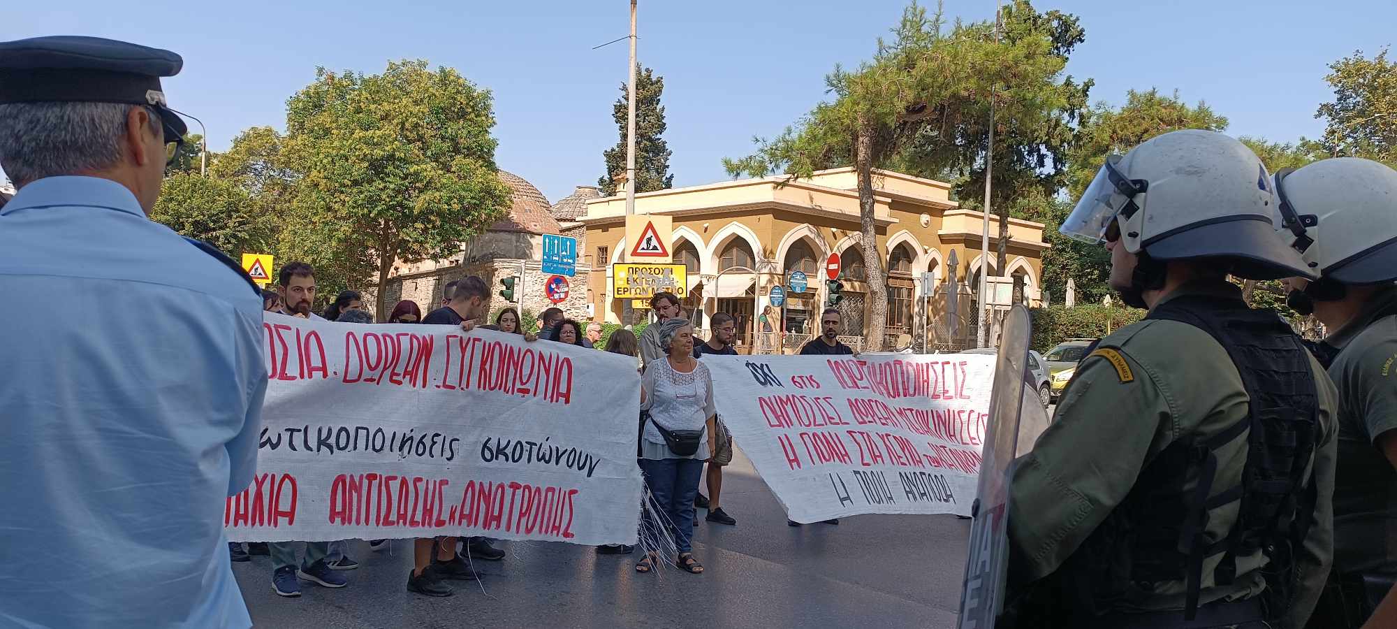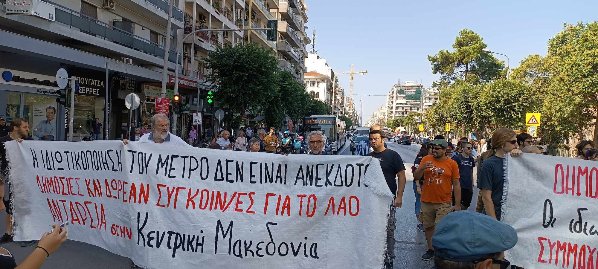 Αστυνομικό μπλόκο συνάντησαν δημοτικές και περιφερειακές παρατάξεις κατά τη διάρκεια της διαμαρτυρίας τους για την ιδιωτικοποίηση του Μετρό ενώ σε εξέλιξη βρισκόταν η επίσκεψη του πρωθυπουργού στον σταθμό του Μετρό της Αγ. Σοφίας. Ο Κ. Μητσοτάκης παρέστη στην εκδήλωση υπογραφής της σύμβασης για τη διαχείριση, συντήρηση και λειτουργία του Μετρό Θεσσαλονίκης με τον ιταλογαλλικό όμιλο THEMA (THEMA Consortium). Όπως αναφέρουν στα καλέσματά τους το Μετρό θα ιδιωτικοποιηθεί πριν καν λειτουργήσει.