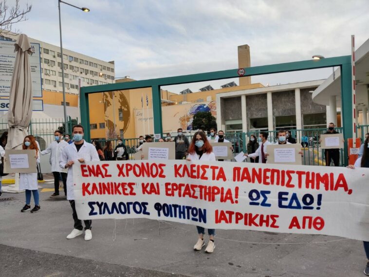 Κρατώντας πλακάτ με συνθήματα όπως «Γιατροί απ’ το PC – το μέλλον του ΕΣΥ;», «δώστε λεφτά για ΜΕΘ – Παιδεία όχι για καταστολή και τρομοκρατία» και με το πανό τους που έγραφε «Ένας χρόνος κλειστά πανεπιστήμια, κλινικές και εργαστήρια! Ως εδώ!», φοιτητές Ιατρικής του Αριστοτέλειου Πανεπιστημίου Θεσσαλονίκης, διαμαρτυρήθηκαν, το απόγευμα της Παρασκευής, ενάντια στην πολιτική της κυβέρνησης που κρατά εδώ και ένα χρόνο κλειστές τις σχολές, τα εργαστήρια και τις κλινικές τους.
