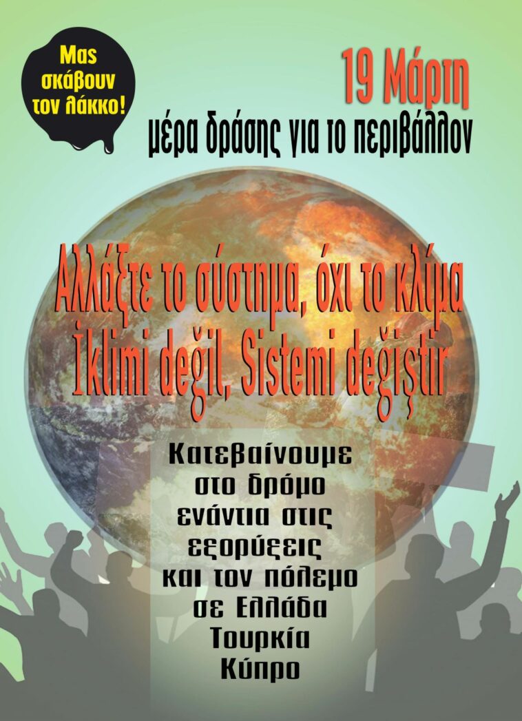 Αυτή την Παρασκευή, 19 Μάρτη 2021 έχει καλεστεί μια Παγκόσμια Απεργία/Διαμαρτυρία για το Κλίμα (Global Climate Strike) σε παγκόσμιο επίπεδο από το κίνημα της νεολαίας ενάντια στην κλιματική αλλαγή (Fridays For Future). Η συνεργασία ενάντια στον πόλεμο και τις εξορύξεις “Μας σκάβουν τον λάκκο / Kazma Bırak / Don’t Dig”, καλεί σε δράσεις σε Ελλάδα, Τουρκία και Κύπρο.