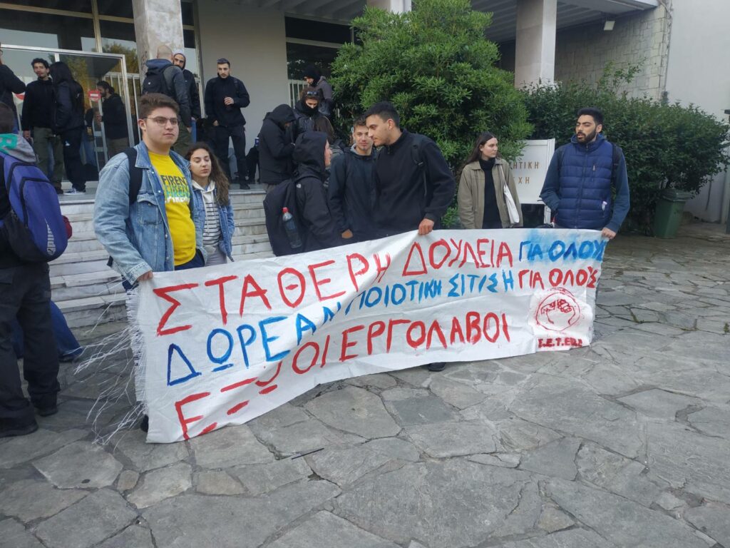 Διαμαρτυρία πραγματοποίησαν φοιτητές-τριες του ΑΠΘ αλλά και εργατικά σωματεία έξω από τη λέσχη του πανεπιστημίου περιφρουρώντας τον χώρο από νωρίς το πρωί της Πέμπτης. Η διαμαρτυρία αφορά τις απολύσεις που έχουν γίνει στην λέσχη του ΑΠΘ που λειτουργεί από εργολαβία αλλά και τη μείωση των μερίδων φαγητού από 6.000 σε μόλις 2.900 την ημέρα καθώς και την επιβολή ελέγχου της εισόδου. Οι εργαζόμενοι διεκδικούν την επαναπρόσληψη των πέντε εργαζομένων που απολύθηκαν μετά το Πάσχα ζητώντας μόνιμη και σταθερή δουλειά για όλους/ες, συλλογική σύμβαση εργασίας, νέες προσλήψεις για τη σωστή λειτουργία των μαγειρείων, ποιοτική, δωρεάν και χωρίς έλεγχο σίτιση των φοιτητών αλλά και το να φύγουν οι εργολαβίες από το Πανεπιστήμιο.