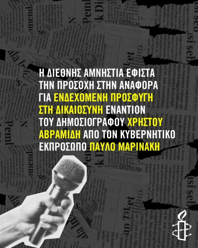 Η Διεθνής Αμνηστία εφιστά την προσοχή στην αναφορά για ενδεχόμενη προσφυγή στη δικαιοσύνη εναντίον του δημοσιογράφου Χρήστου Αβραμίδη από τον κυβερνητικό εκπρόσωπο Παύλο Μαρινάκη.