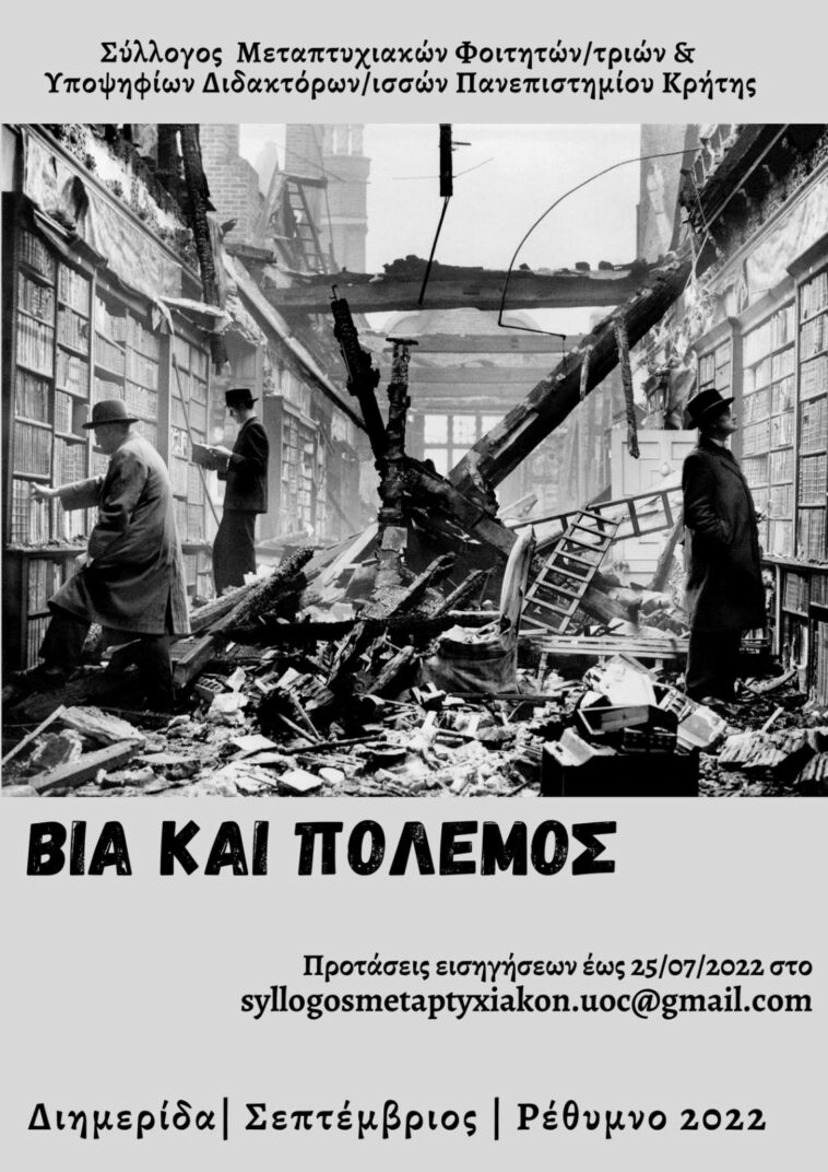 Ο Σύλλογος Μεταπτυχιακών φοιτητών/ριων και Υπ. Διδακτόρων/ισσων Παν. Κρήτης απευθύνει κάλεσμα συμμετοχής στην διημερίδα που πρόκειται να διεξαχθεί με θέμα “Βία και Πόλεμος”, το ερχόμενο φθινόπωρο στο Ρέθυμνο.