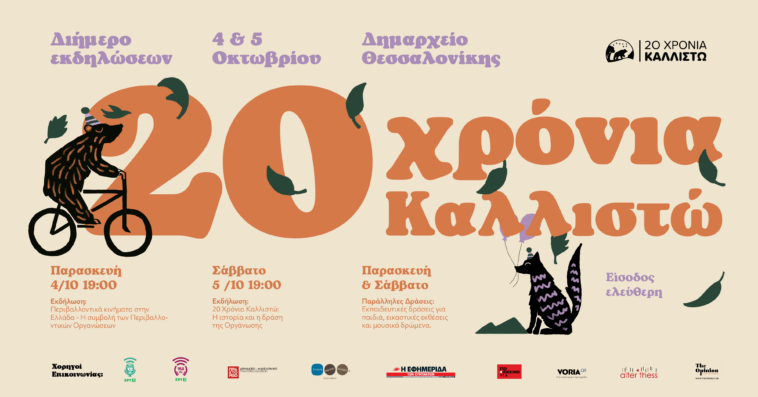 Φέτος η Περιβαλλοντική Οργάνωση για την Άγρια Ζωή και τη Φύση “Καλλιστώ” κλείνει 20 χρόνια ζωής και δράσης. Στο πλαίσιο εορτασμού της επετείου αυτής, διοργανώνεται ένα διήμερο εκδηλώσεων στις 4 και 5 Οκτωβρίου 2024, στο αίθριο του Δημαρχιακού Μεγάρου Θεσσαλονίκης. Σε περίπτωση κακοκαιρίας οι εκδηλώσεις θα πραγματοποιηθούν στην διπλανή αίθουσα “Μανώλης Αναγνωστάκης”.