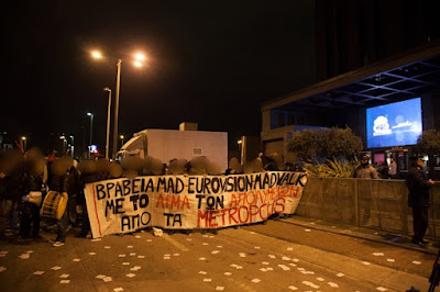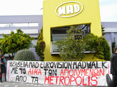 Αντιλαμβανόμενοι/ες ότι η φετινή ανάθεση του τελικού της Eurovision στο MAD του Ανδρέα Κουρή είχε επιτηδευμένα περάσει στα «ψιλά», αφού αντίθετα από το 2014 και το 2015 είχε προβληθεί έντονα από το MAD και τα μέσα ενημέρωσης, θελήσαμε να υπενθυμίσουμε στον Ανδρέα Κουρή τις οικονομικές εκκρεμότητες που έχει απέναντί μας. Έτσι, απολυμένοι/ες των καταστημάτων Metropolis προχωρήσαμε σε παρέμβαση έξω από το Christmas Theater όπου διεξαγόταν ο ελληνικός τελικός της Eurovision στις 30 Ιανουαρίου υπενθυμίζοντας στον Ανδρέα Κουρή την πρόσφατη απόφαση του Εφετείου. Κατά την παρέμβαση πετάχτηκαν χιλιάδες τρικάκια που έγραφαν: «Ανδρέα Κουρή μην ξεχνάς μας χρωστάς (Δικαστική απόφαση 4795/2024)». Κατά την έναρξη της παρέμβασης περικυκλωθήκαμε από σεκιουριτάδες της εταιρείας Target Security που είχε προσλάβει η ΕΡΤ, που μας απαγόρεψαν να δράσουμε, κάτι που τελικά δεν συνέβη, ενώ ένας εξ αυτών ακινητοποίησε πισθάγκωνα μέλος μας ασκώντας παράνομη βία και υπερβαίνοντας τις αρμοδιότητες που του δίνει ο νόμος, γεγονός που καταγγέλλουμε δημόσια.