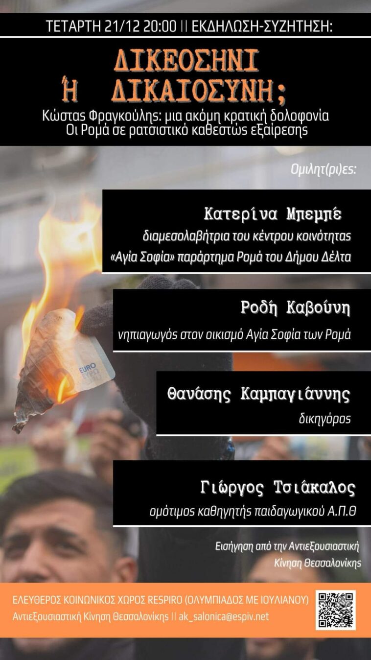 Στόχος της παρούσας εκδήλωσης/συζήτησης αποτελεί το να ανοιχτούν και να συζητηθούν ευρύτερα όλα τα ζήτημα ορατότητας των κοινοτήτων των Ρομά σε συνδυασμό με τις υποθέσεις εκτελέσεων-δολοφονιών του Νίκου Σαμπάνη και του Κώστα Φραγκούλη από την ΕΛ.ΑΣ. Να πιάσουμε το νήμα της συλλογικής αντίστασης και αλληλεγγύης για μία ζωή που να αξίζει να βιωθεί.
