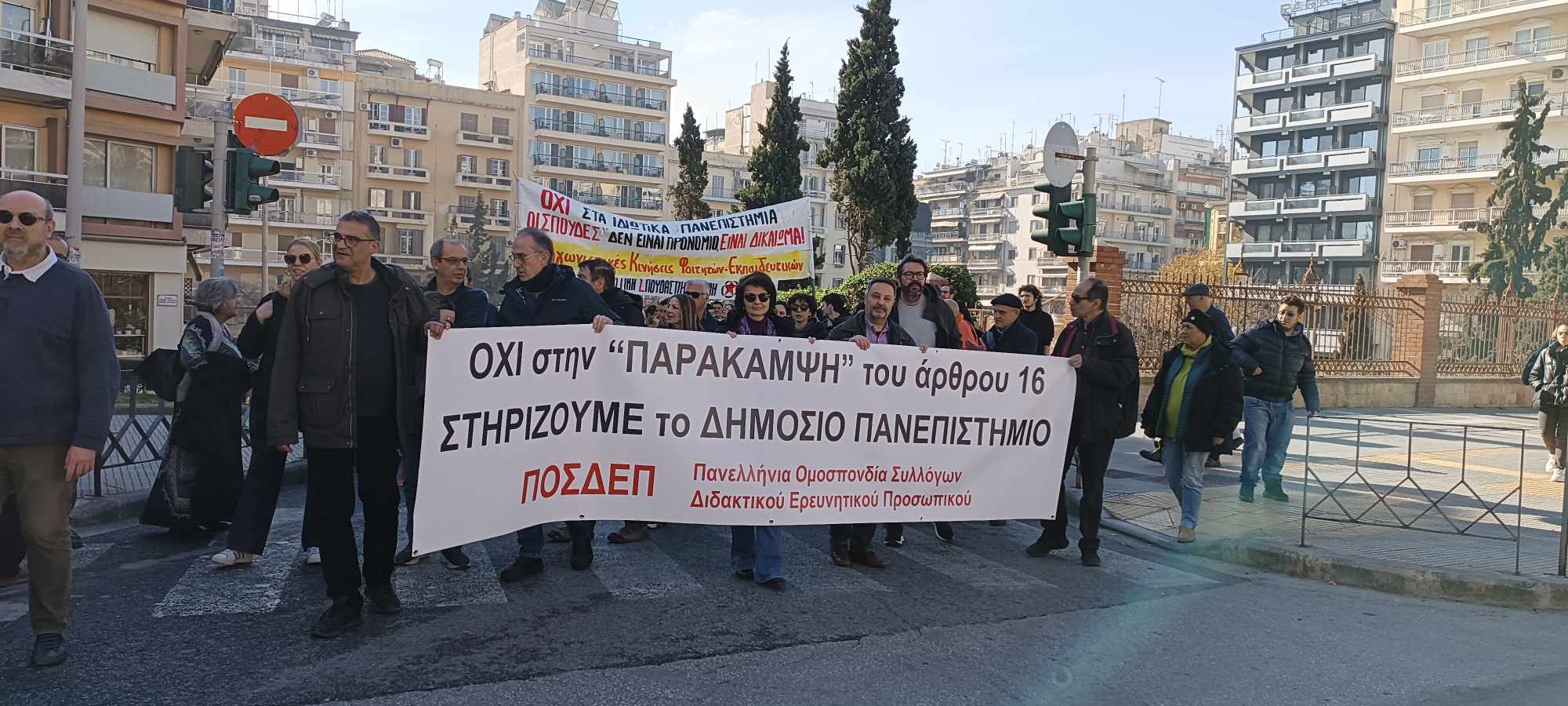 Με μαζικό μπλοκ κατέβηκαν στη διαδήλωση σήμερα και οι πανεπιστημιακοί μέλη της ΠΟΣΔΕΠ και με σύνθημα «όχι στην παράκαμψη του άρθρου 16-στηρίζουμε το δημόσιο πανεπιστήμιο».
