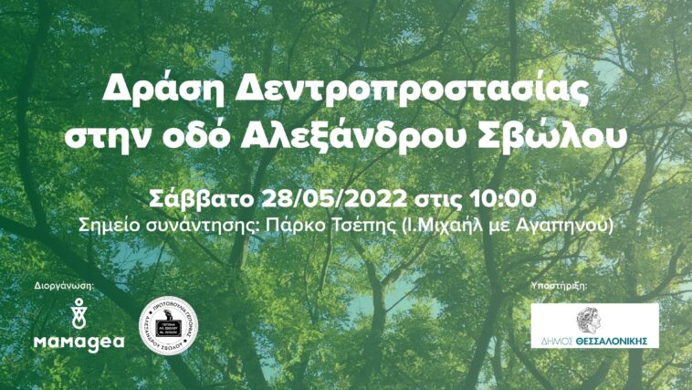 Η Περιβαλλοντική Οργάνωση Μαμαγαία και η Πρωτοβουλία Γειτονιάς Αλεξάνδρου Σβώλου, με την υποστήριξη του Δήμου Θεσσαλονίκης και της Αντιδημαρχίας Περιβάλλοντος, σας προσκαλούν στη “Δράση Δεντροπροστασίας” που θα πραγματοποιηθεί στην οδό της Αλεξάνδρου Σβώλου, το Σάββατο 28 Μαΐου 2022 στις 10:00, με σημείο συνάντησης το Πάρκο Τσέπης (Ιωάννου Μιχαήλ με Αγαπηνού). Η δράση αποσκοπεί στη μείωση πληθυσμού του σκαθαριού Galerucella luteolla μέσω της εφαρμογής ειδικής βιολογικής κόλλας με τη μορφή δακτυλίου στον κορμό των φτελιών της οδού.