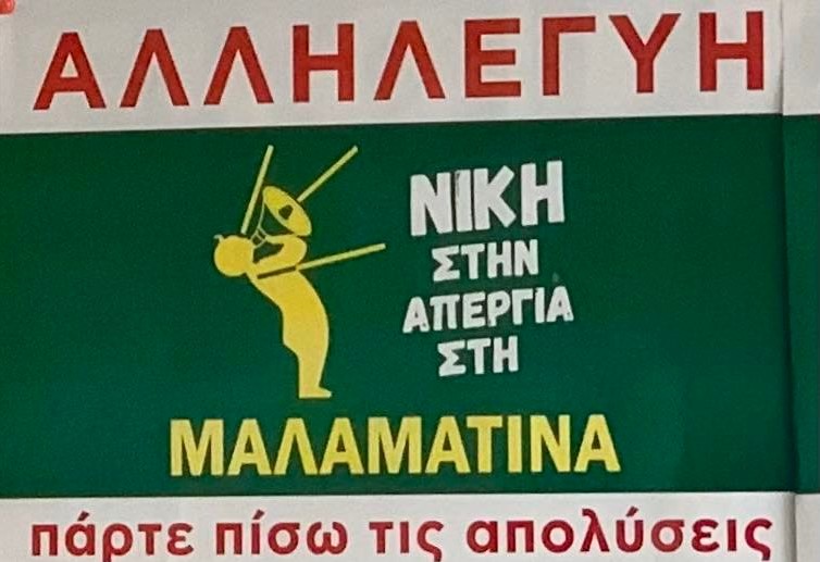 Το σωματείο εργαζομένων στη Μαλαματίνα απηύθυνε κάλεσμα σε συγκέντρωση αλληλεγγύης την Παρασκευή και την Δευτέρα έξω από τα δικαστήρια για να μην περάσει τόσο η τρομοκρατία ενάντια στους εργαζομένους αλλά και για να μην επιβληθούν τα αντεργατικά μέτρα στα οποία πρωτοστατεί η διοίκηση της εταιρείας σε όλη την κοινωνία. Να θυμίσουμε ότι εκτός από τις απολύσεις η διοίκηση της εταιρείας αντιμετώπισε με αστυνομοκρατία και καταστολή τις απεργιακές συγκεντρώσεις που έγιναν έξω από το εργοστάσιο μέσα στο καλοκαίρι.