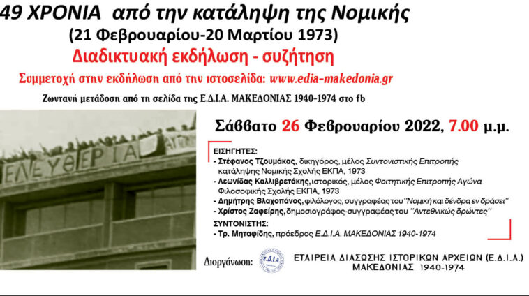 Η εκδήλωση θα πραγματοποιηθεί το Σάββατο 26 Φεβρουαρίου στις 19.00 και θα προβληθεί από τη σελίδα της Εταιρίας Διάσωσης Ιστορικών Αρχείων Μακεδονίας 1940-1974 στο facebook.