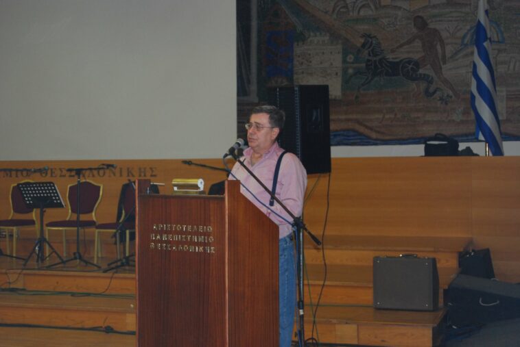 Στη φωτογραφία, ο σ. Δώδος, προλογίζει στην αίθουσα τελετών του ΑΠΘ εκδήλωση-συναυλία αφιερωμένη στα τραγούδια της εξορίας – 20-42013