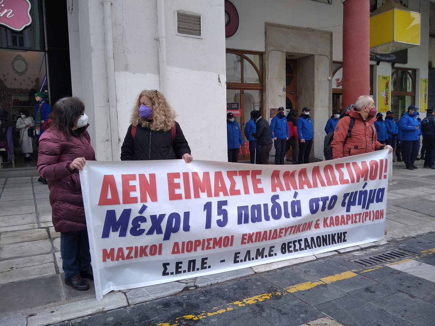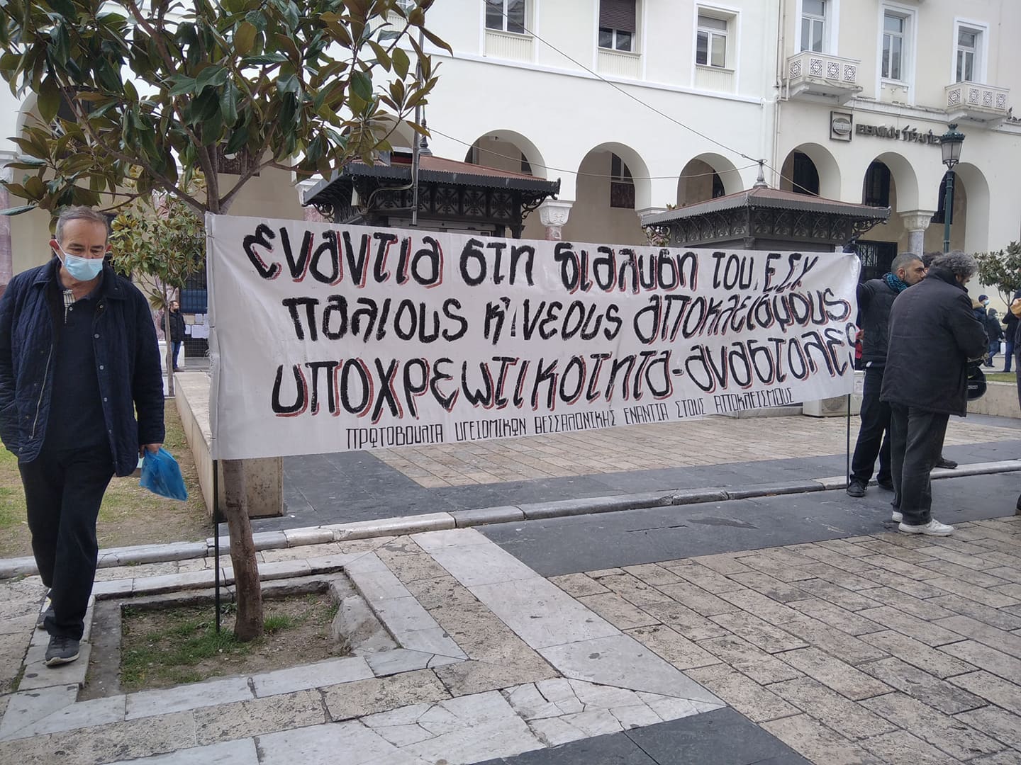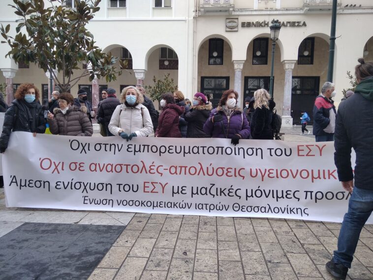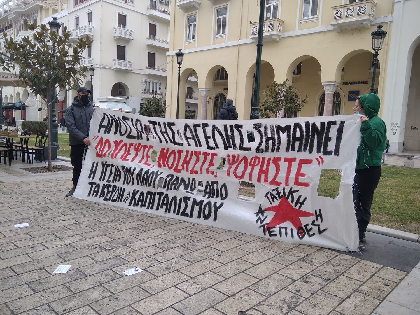 Συγκέντρωση έξω από την 3η και 4η ΥΠΕ στην πλατεία Αριστοτέλους πραγματοποίησαν υγειονομικοί, σωματεία εργαζομένων στα νοσοκομεία αλλά και σύλλογοι εκπαιδευτικών δηλώνοντας για ακόμη μια φορά ότι η πολιτική της κυβέρνησης για την υγεία είναι εγκληματική. Οι υγειονομικοί κινητοποιούνται σήμερα στο πλαίσιο τρίωρης στάσης εργασίας που κήρυξε η ΑΔΕΔΥ και πανελλαδικής μέρας δράσης για την υγεία.