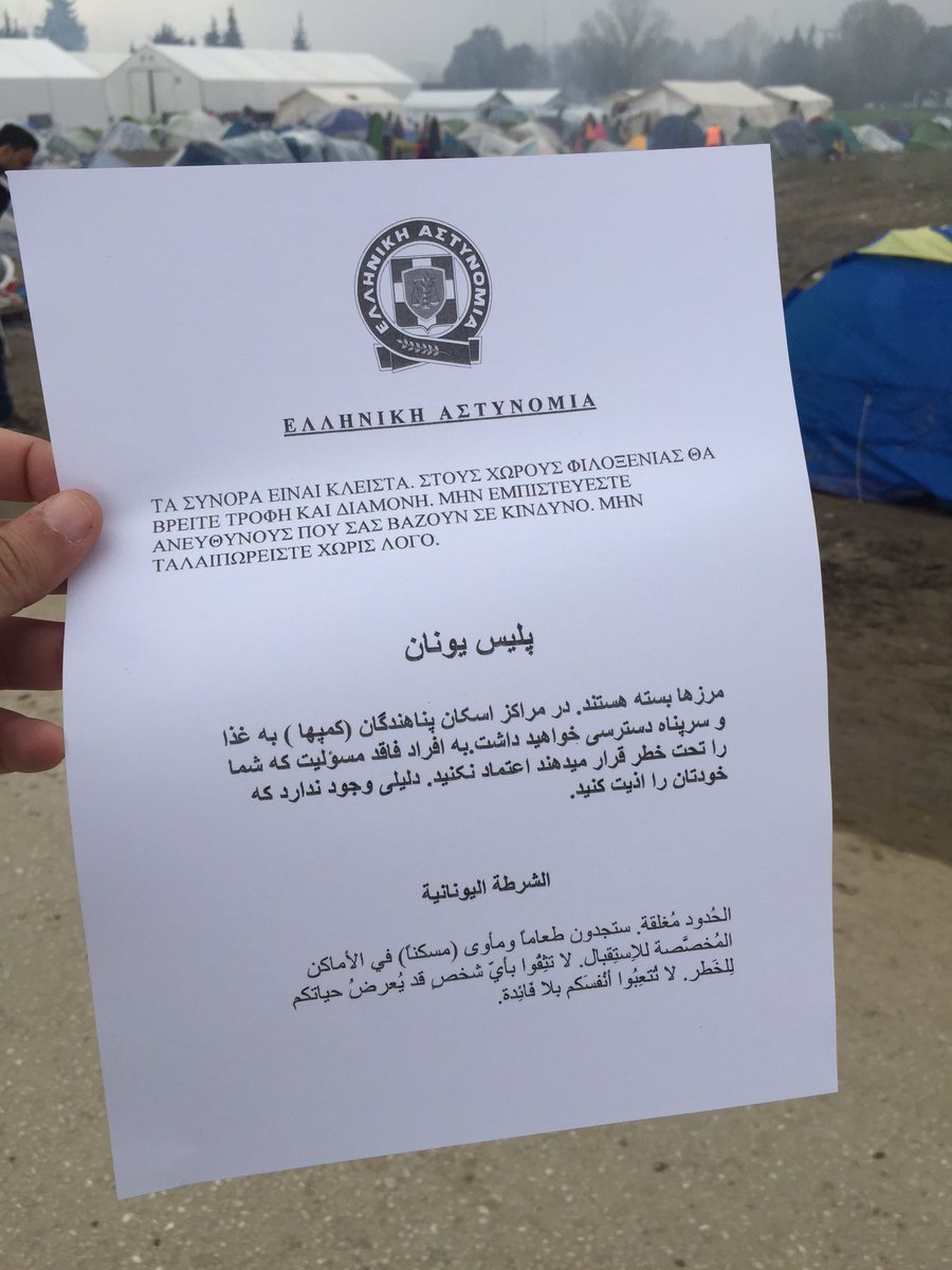 Το φυλλάδιο είναι γραμμένο στα ελληνικά, τα αραβικά και τα φαρσί, και γράφει: ««Τα σύνορα είναι κλειστά. Στους χώρους φιλοξενίας θα βρείτε τροφή και διαμονή. Μην εμπιστεύεστε ανεύθυνους που σας βάζουν σε κίνδυνο. Μην ταλαιπωρείστε χωρίς λόγο».
