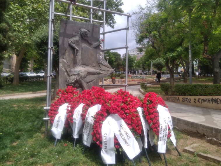 Από το άγαλμα του Βενιζέλου πραγματοποιήθηκε η πορεία των συνδικάτων και σωματείων που πρόσκεινται στο ΠΑΜΕ με πολλά άτομα να κρατούν στεφάνια και γαρύφαλλα στα χέρια φωνάζοντας συνθήματα ενάντια στον πόλεμο και την ανεργία. Η συγκέντρωση ξεκίνησε με συναυλία από τον Δημήτρης Ζερβουδάκη, πρόεδρο του Συλλόγου Μουσικών Βορείου Ελλάδος, που κάλεσε τον κόσμο στην αντιπολεμική συναυλία στις 8 Μάη.