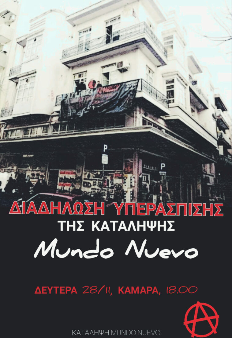 Διαδήλωση υπεράσπισης της κατάληψης Mundo Nuevo που εκκενώθηκε το πρωί μετά από μια θεαματική εισβολή της αστυνομίας θα πραγματοποιηθεί στις 18:00 στην Καμάρα. Αστυνομικοί της ομάδας ΟΠΚΕ και της Υποδιεύθυνσης Κρατικής Ασφάλειας εισέβαλαν τις πρώτες πρωινές ώρες στο κτίριο στη συμβολή της οδού Σιατίστης και Φιλίππου και πραγματοποίησαν τέσσερις συλλήψεις. Οι αστυνομικές δυνάμεις έχουν αποκλείσει την περιοχή.