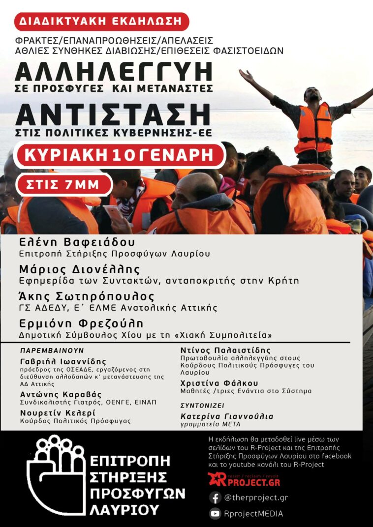 Διαδικτυακή εκδήλωση με θέμα «Φράκτες-Επαναπροωθήσεις-Απελάσεις-Άθλιες συνθήκες διαβίωσης-Eπιθέσεις φασιστοειδών» θα πραγματοποιηθεί σήμερα, Κυριακή 10 Ιανουαρίου, στις 19.00 από την Επιτροπή Στήριξης Προσφύγων Λαυρίου και το Rproject.