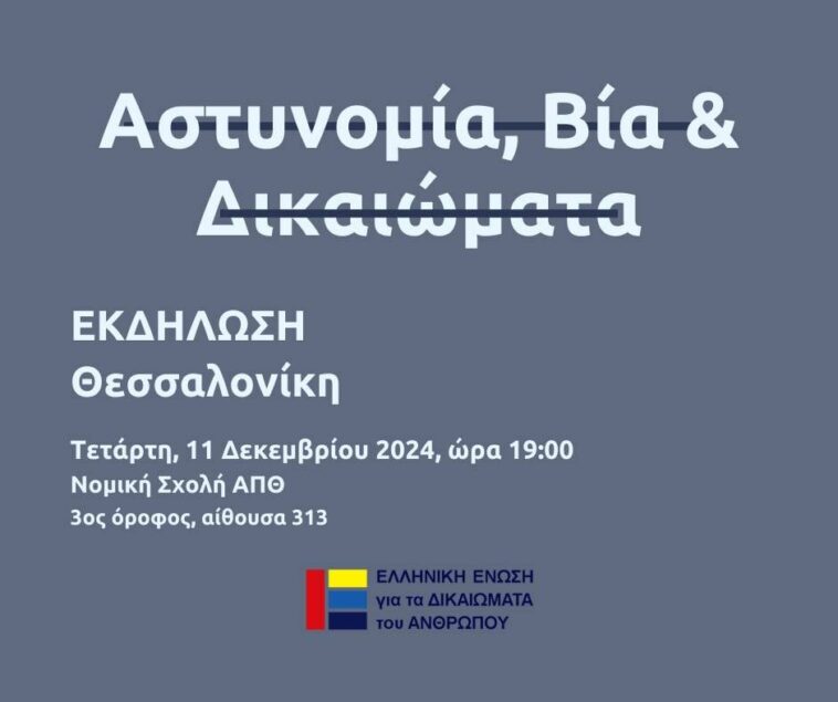 Η Ελληνική Ένωση για τα Δικαιώματα του Ανθρώπου (ΕλΕΔΑ) σε συνέχεια της δημοσίευσης της μελέτης με τίτλο “Αστυνομία, βία και δικαιώματα: μια επισκόπηση της αστυνομικής αυθαιρεσίας στην Ελλάδα” διοργανώνει εκδήλωση παρουσίασης και στη Θεσσαλονίκη.