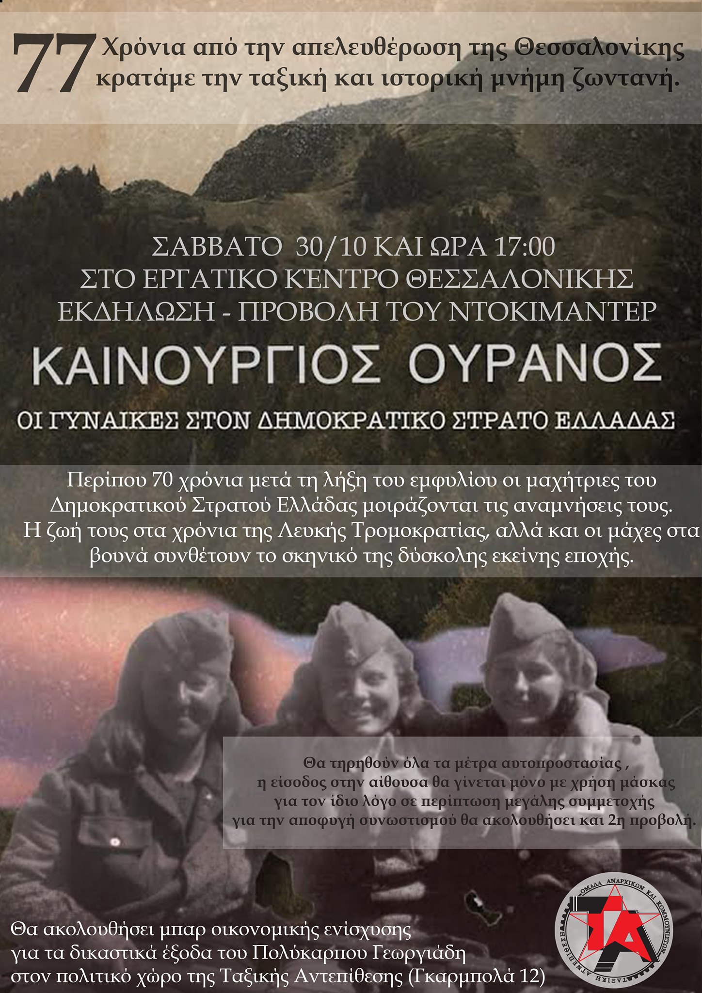 Το Σάββατο 30 Οκτωβρίου στις 17.00 στο Εργατικό Κέντρο, η Ταξική Αντεπίθεση Θεσσαλονίκης (ομάδα αναρχικών και κομμουνιστών) διοργανώνει εκδήλωση και προβολή του ντοκιμαντέρ «Καινούργιος Ουρανός» με αφορμή της επέτειο 77 χρόνων από την απελευθέρωση της πόλης.