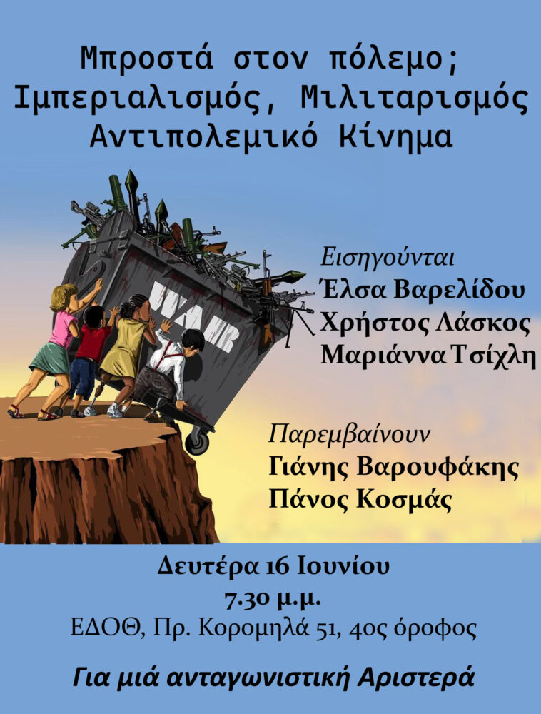 Εκδήλωση με τίτλο “Μπροστά στον πόλεμο; Ιμπεριαλισμός, Μιλιταρισμός. Αντιπολεμικό Κίνημα” διοργανώνει η πρωτοβουλία για μια ανταγωνιστική Αριστερά, την Δευτέρα 16 Ιουνίου στις 19:30 στην ΕΔΟΘ (Πρ. Κορομηλά 51, 4ος όροφος).