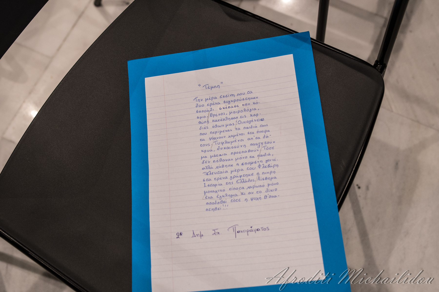 Το «έγκλημα στα Τέμπη» αποτέλεσε ένα ακόμη συλλογικό τραύμα κι έτσι το αντανακλά η ίδια η κοινωνία πίσω. Η δύναμη των λίγων, φτάνει για πολλούς. Τα δάκρυα των λίγων, στάζουν αρκετά για όλους. Αυτή είναι η απάντηση στην μοιρολατρική αντίληψη ότι «ξεχάσαμε». Υποβιβάζοντας η πολιτεία τον θάνατο που παίρνει τόσες μορφές καθημερινά, υποτιμώνται οι ζωές μας. Και αυτό πρέπει να ανατραπεί με την τιμωρία των υπευθύνων. Ο μόνος επιζών, ο Γεράσιμος, ακόμη βρίσκεται σε κρίσιμη κατάσταση σε κώμα. Τα βαγόνια έχουν εξαφανιστεί και ο χώρος τσιμεντώθηκε. Ακόμη και η ίδια αυτή εκδήλωση συνάντησε εχθρούς κι εμπόδια που καταμαρτυρούν την άκρη του νήματος.