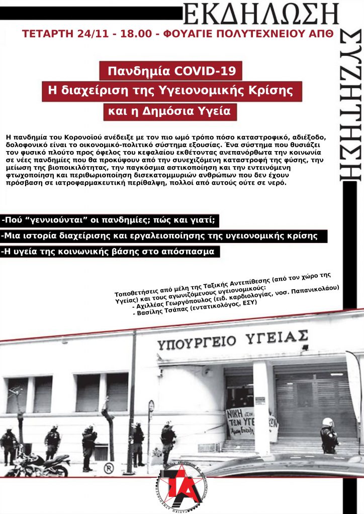 Εκδήλωση με θέμα «Πανδημία Covid-19, διαχείριση της Υγειονομικής Κρίσης & Δημόσια Υγεία» διοργανώνεται σήμερα, Τετάρτη 24 Νοεμβρίου, στις 18.00 στο Φουαγιέ του Πολυτεχνείου του ΑΠΘ από την Ταξική Αντεπίθεση Θεσσαλονίκης, ομάδα αναρχικών και κομμουνιστ(ρι)ών. Στην εκδήλωση θα τοποθετηθούν μέλης της συλλογικότητας από τον χώρο της Υγείας, οι Αχιλλέας Γεωργόπουλος (ειδικευόμενος καρδιολογίας, νοσοκομείο Παπανικολάου) και Βασίλης Τσάπας (ενταντικολόγος, ΕΣΥ) καθώς και άλλοι γιατροί και νοσηλευτές.