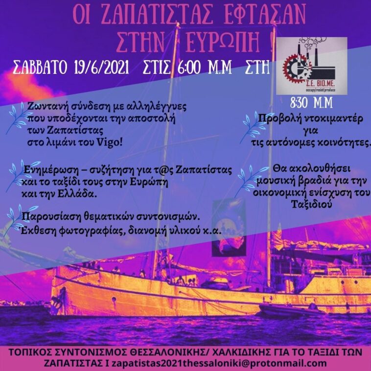 Το Σάββατο 19 Ιουνίου, από τις 6μμ, στη ΒΙΟΜΕ, το Συντονιστικό Θεσσαλονίκης-Χαλκιδικής, ενόψει της άφιξης του πλοίου «Λα Μοντάνια» και της ζαπατιστικής Μοίρας 421 στο Vigo της Γαλικίας, διοργανώνει: