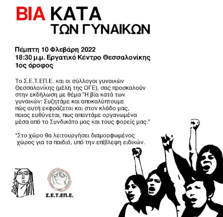 Εκδήλωση με θέμα «Η βία κατά των γυναικών – Συζητάμε και αποκαλύπτουμε πώς αυτή εκφράζεται στον κλάδο μας, ποιος ευθύνεται και πώς απαντάμε οργανωμένα μέσα από το συνδικάτο και τους φορείς μας» διοργανώνει το ΣΕΤΕΠΕ μαζί με συλλόγους γυναικών της πόλης, την Πέμπτη 10 Φλεβάρη στις 18.30 στο Εργατικό Κέντρο Θεσσαλονίκης.