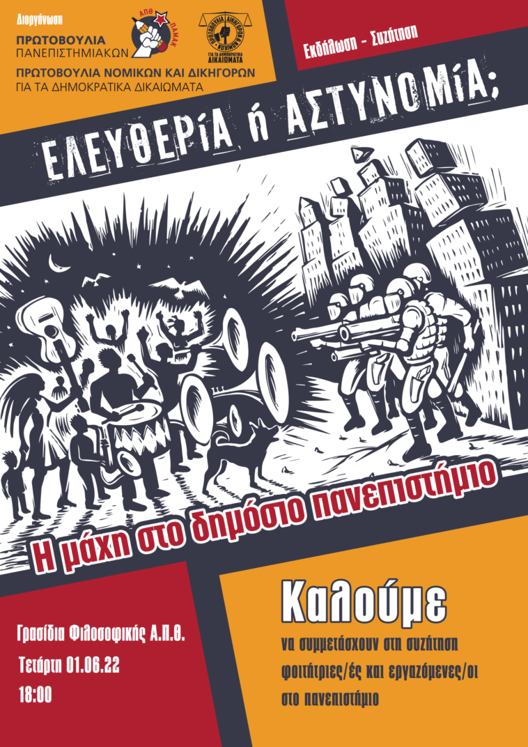 Εκδήλωση-συζήτηση διοργανώνει αύριο η «Πρωτοβουλία Πανεπιστημιακών ΠΑΜΑΚ-ΑΠΘ» και η «Πρωτοβουλία Δικηγόρων και Νομικών για τα Δημοκρατικά Δικαιώματα» την Τετάρτη 1 Ιουνίου και ώρα 18:00 με θέμα «Ελευθερία ή αστυνομία; Η μάχη στο δημόσιο πανεπιστήμιο». Η εκδήλωση θα πραγματοποιηθεί στα γρασίδια της Φιλοσοφικής του ΑΠΘ.