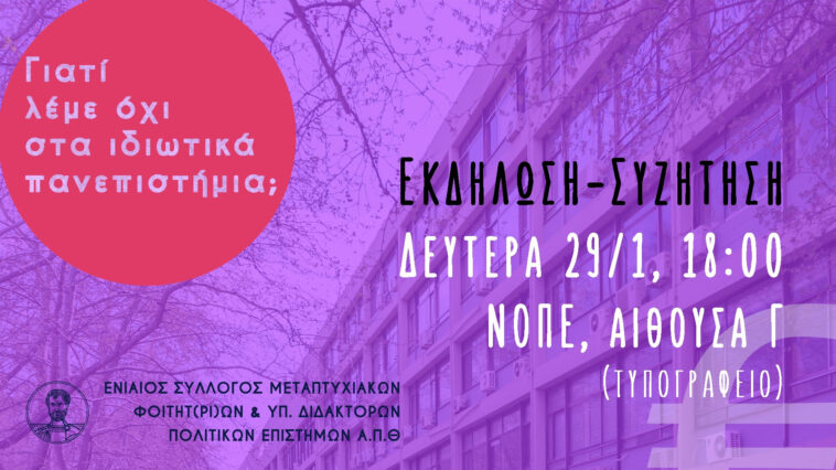 Ο Ενιαίος Σύλλογος Μεταπτυχιακών Φοιτητ(ρι)ών και Υποψηφίων Διδακτόρων του Τμήματος Πολιτικών Επιστημών ΑΠΘ διοργανώνει εκδήλωση-συζήτηση με επίκεντρο τις απαντήσεις σε αυτά τα διατυπωμένα με περισσότερη ή λιγότερη αφέλεια ερωτήματα που απασχολούν το δημόσιο διάλογο το τελευταίο διάστημα. Με προσκεκλημένους/ες και συμμετέχοντες/ουσες προερχόμενες από όλες τις ακαδημαϊκές βαθμίδες, θα διερευνηθούν οι επιπτώσεις που θα έχει το νέο νομοσχέδιο για τα μη-κρατικά ΑΕΙ τόσο στις σπουδές και το μέλλον των φοιτητ(ρι)ών σε προπτυχιακό και μεταπτυχιακό επίπεδο, όσο και στην παραγωγή επιστημονικού έργου από υποψήφιους/ες διδάκτορες και εργαζόμενους/ες στην έρευνα.