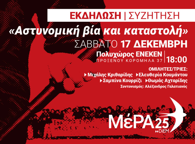 Εκδήλωση-συζήτηση για την αστυνομική βία και καταστολή διοργανώνει το ΜέΡΑ25 Θεσσαλονίκης το Σάββατο 17 Δεκέμβρη στις 6.00 μ.μ., στον Πολυχώρο ΕΝΕΚΕΝ (Προξένου Κορομηλά 37).