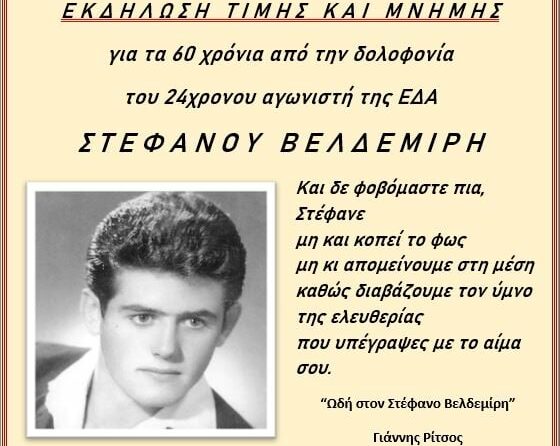 Φέτος, στις 26 Οκτωβρίου, συμπληρώνονται 60 χρόνια από την δολοφονία του νεαρού αγωνιστή της ΕΔΑ Στέφανου Βελδεμίρη από το κράτος της μετεμφυλιακής δεξιάς. Φίλοι, συναγωνιστές και σύντροφοι του Στέφανου σε μια εκδήλωση τιμής και μνήμης θα μαζευτούν στο ίδιο σημείο που ο αστυνομικός Φιλίππου πριν 60 χρόνια σημάδεψε και πυροβόλησε εναντίον των νεολαίων της ΕΔΑ Στέφανου Βελδεμίρη και Μόρφη Στεφούδη, σκοτώνοντας τον Στέφανο.