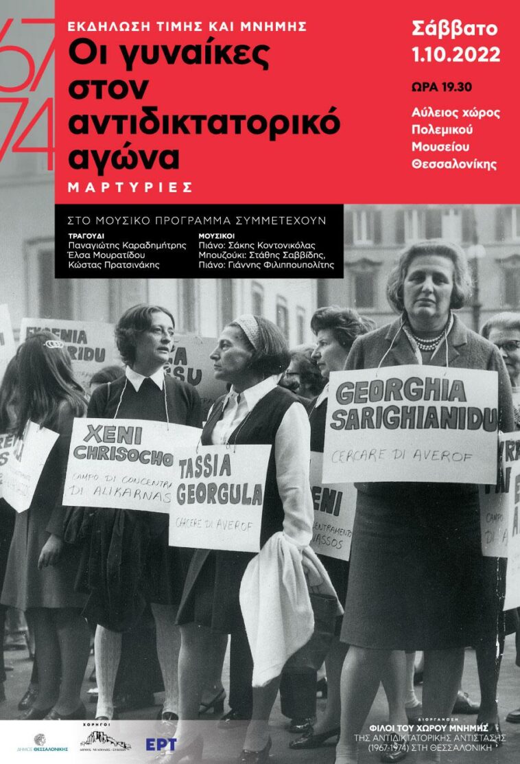 Στη γυναίκα της αντιδικτατορικής αντίστασης (1967-1974) είναι αφιερωμένη η εκδήλωση τιμής και μνήμης, που θα πραγματοποιηθεί το Σάββατο, 1η Οκτωβρίου 2022, 7.30 μ.μ., στον αύλειο χώρο του Πολεμικού Μουσείου, με διοργανώτρια την Εταιρεία Φίλων του Χώρου Μνήμης της Αντιδικτατορικής Αντίστασης στη Θεσσαλονίκη.