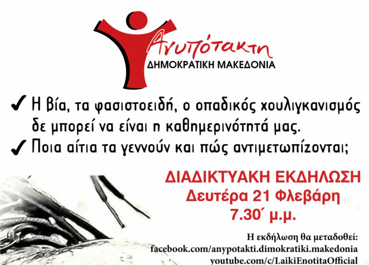 Η Περιφερειακή Παράταξη ΑΝΥΠΟΤΑΚΤΗ ΔΗΜΟΚΡΑΤΙΚΗ ΜΑΚΕΔΟΝΙΑ, με αφορμή την βία στα σχολεία, την ενδοοικογενειακή βία, τον οπαδικό χουλιγκανισμό, τα φασιστοειδή, φαινόμενα που τείνουν να γίνουν καθημερινά, διοργανώνει διαδικτυακή εκδήλωση, επιχειρώντας να ανοίξει την συζήτηση για τα αίτια που τα γεννούν και πως αντιμετωπίζονται.