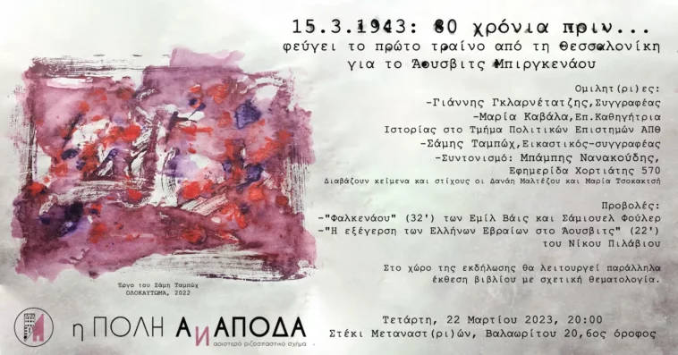 Την Τετάρτη 22 Μαρτίου, με αφορμή τη συμπλήρωση 80 χρόνων από τότε που έφυγαν από τη Θεσσαλονίκη τα τρένα για το Άουσβιτς, φορτωμένα με Εβραίους συμπολίτες μας, ακρωτηριάζοντας βάναυσα την πόλη μας, η Πόλη Ανάποδα θα θυμίσει τη μαύρη εκείνη περίοδο, με μια εκδήλωση στον καινούριο χώρο του Στεκιού Μεταναστών (Βαλαωρίτου 20, 6ος όροφος).