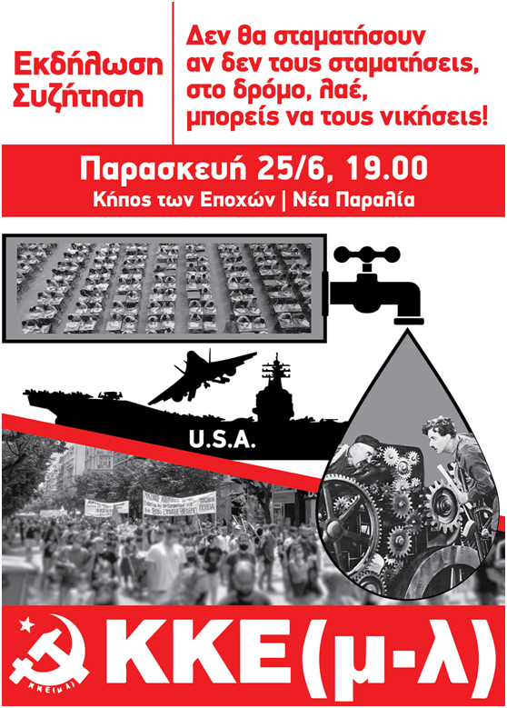 Την Παρασκευή 25 Ιουνίου, στις 19.00, στο Πάρκο των Εποχών (Νέα Παραλία), η Κομματική Οργάνωση Θεσσαλονίκης του ΚΚΕ (μ-λ) διοργανώνει ανοιχτή εκδήλωση-συζήτηση με θέμα: «Δεν θα σταματήσουν αν δεν τους σταματήσεις, στο δρόμο λαέ μπορείς να τους νικήσεις». Εισηγήσεις θα πραγματοποιήσουν οι Γιώργος Ματσούκας και Τάσος Σαπουνάς.