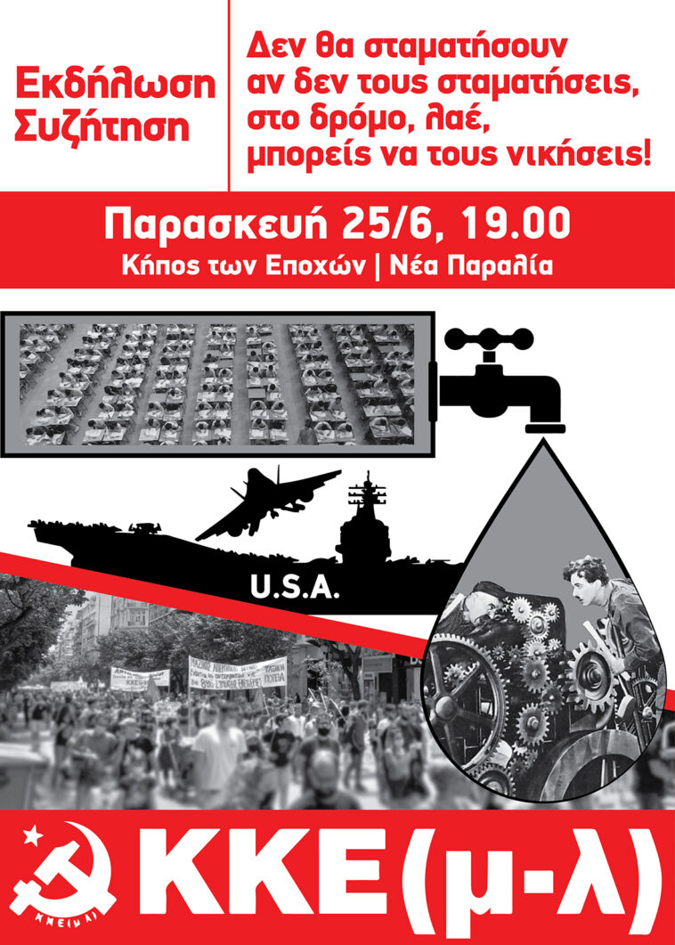 Την Παρασκευή 25/6, στις 19:00, στο Πάρκο των Εποχών (Νέα Παραλία), η Κομματική Οργάνωση Θεσσαλονίκης του ΚΚΕ (μ-λ) σας προσκαλεί σε ανοιχτή εκδήλωση-συζήτηση με θέμα: «Δεν θα σταματήσουν αν δεν τους σταματήσεις, στο δρόμο λαέ μπορείς να τους νικήσεις».