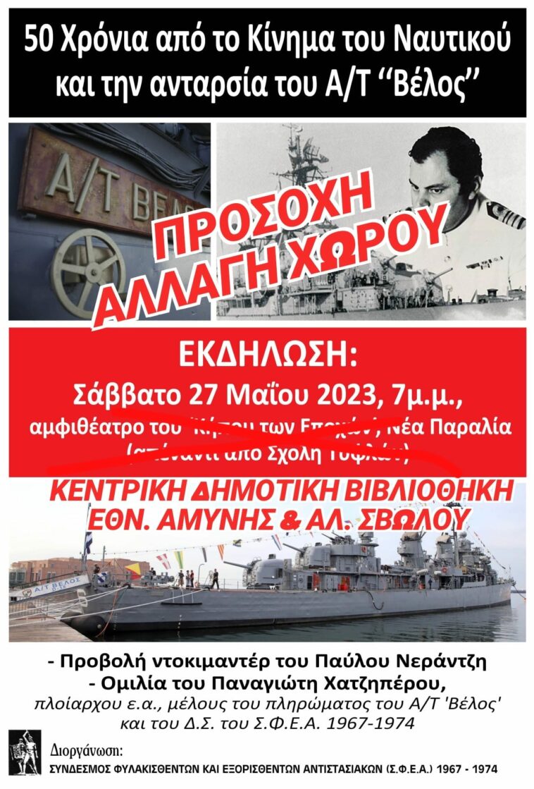 Εκδήλωση για τα 50 χρόνια από την Ανταρσία του ‘Α/Τ ΒΕΛΟΣ’ και το ‘Κίνημα του Ναυτικού’ (22-25/5/1973) διοργανώνει ο Σύνδεσμος Φυλακισθέντων Εξορισθέντων Αντιστασιακών 1967-1974 το Σάββατο 27 Μαΐου 2023, στις 7μ.μ., στην Κεντρική Δημοτική Βιβλιοθήκη.