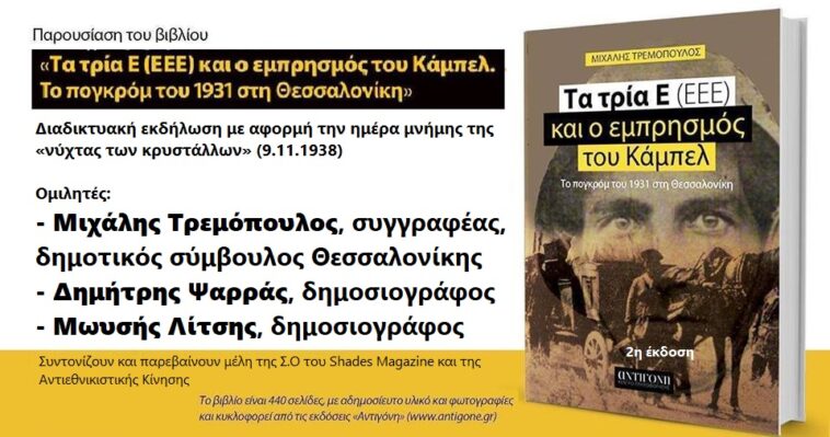 Εκδήλωση – βιβλιοπαρουσίαση με θέμα το βιβλίο του Μιχάλη Τρεμόπουλου «Τα τρία Ε και ο εμπρησμός του Κάμπελ, Το πογκρόμ του 1931 στη Θεσσαλονίκη» γίνεται με αφορμή την ημέρα μνήμης της νύχτας του εθνικοσοσιαλιστικού πογκρόμ (09/11/1938), γνωστού και ως «η νύχτα των κρυστάλλων».