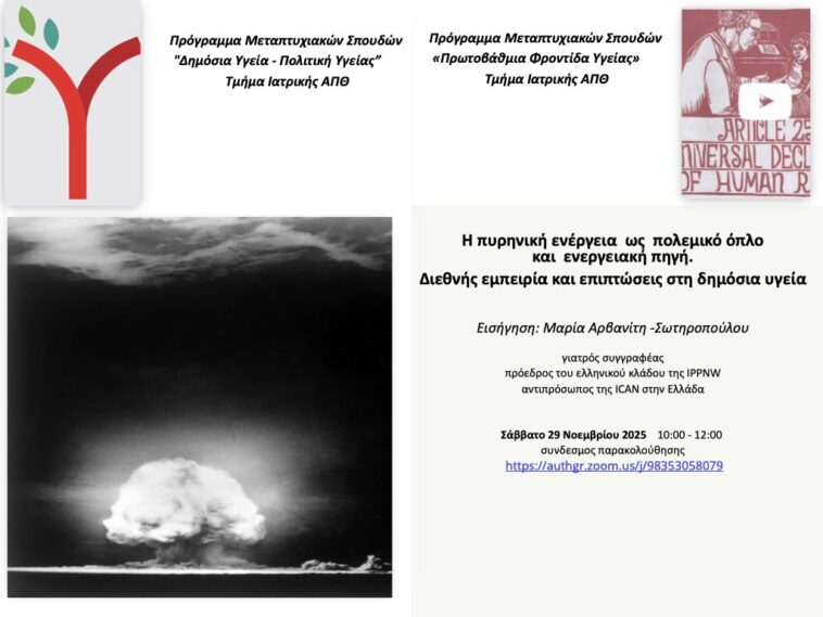 Εκδήλωση με θέμα την πυρηνική  ενέργεια και τις επιπτώσεις της στη δημόσια υγεία θα πραγματοποιηθεί το Σάββατο στο πλαίσιο των Προγραμμάτων Μεταπτυχιακών Σπουδών Τμήματος Ιατρικής ΑΠΘ «Δημόσια Υγεία – Πολιτική Υγείας»” & “Πρωτοβάθμια Φροντίδα Υγείας”