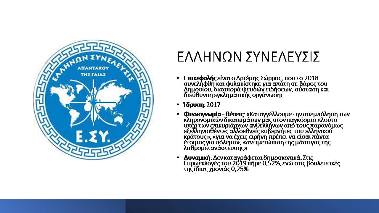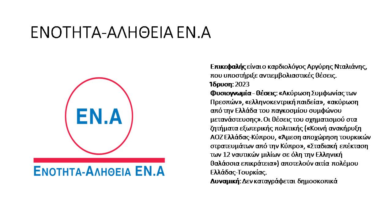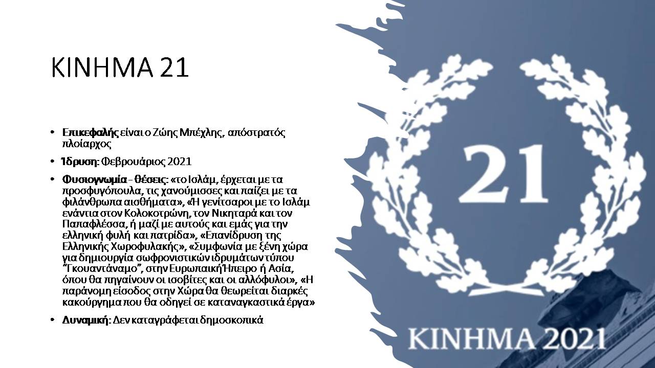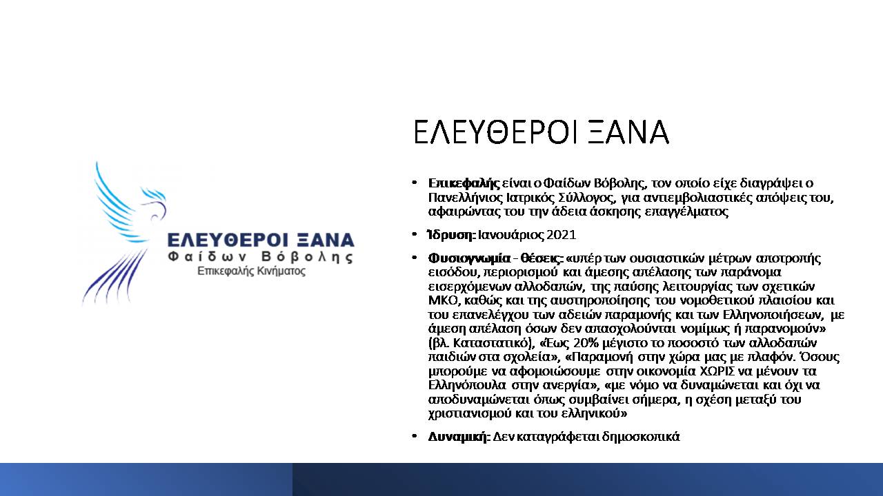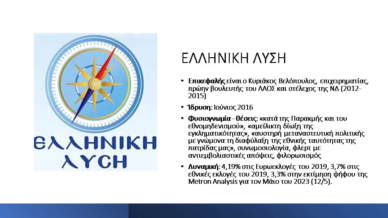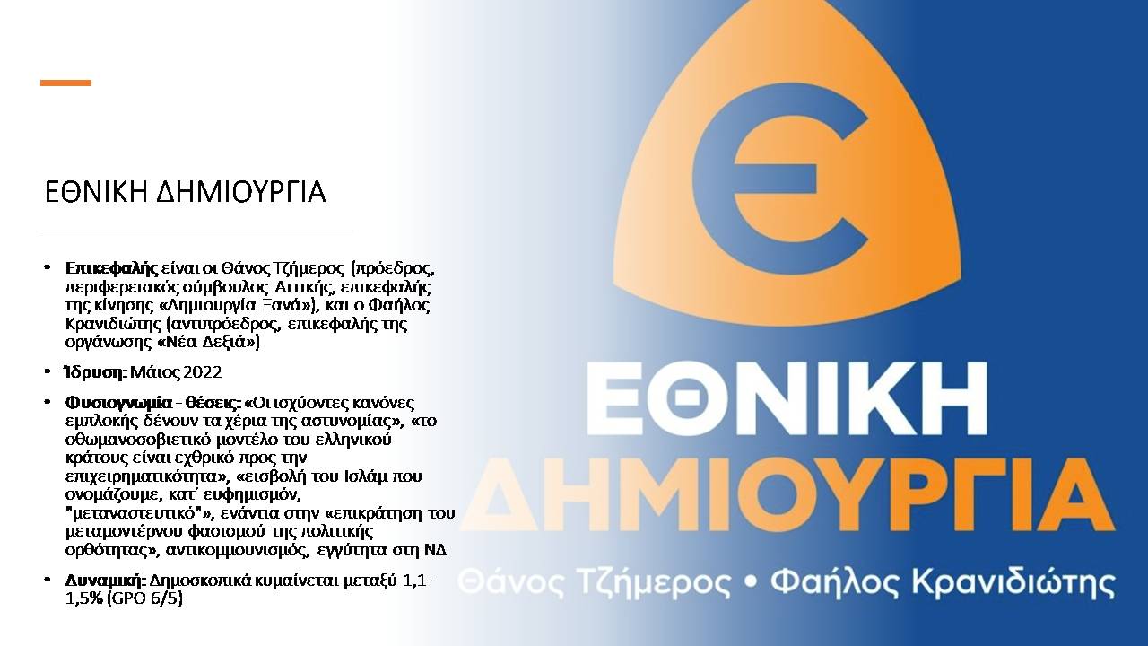 Στο πλαίσιο του αφιερώματος Εκλογές και Ακροδεξιά (μια συνεργασία του “Σημείου για τη Μελέτη και την Αντιμετώπιση της Ακροδεξιάς” με το Alterthess) παρουσιάζουμε με αλφαβητική σειρά, τους ακροδεξιούς σχηματισμούς που θα λάβουν μέρος στις εκλογές της 21ης Μαΐου 2023, και τα βασικά χαρακτηριστικά τους. Στο τέλος αυτού του άρθρου θα βρείτε τα συμπεράσματά μας και ορισμένες παρατηρήσεις για τη μεθοδολογία που ακολουθήσαμε σε αυτή την παρουσίαση.