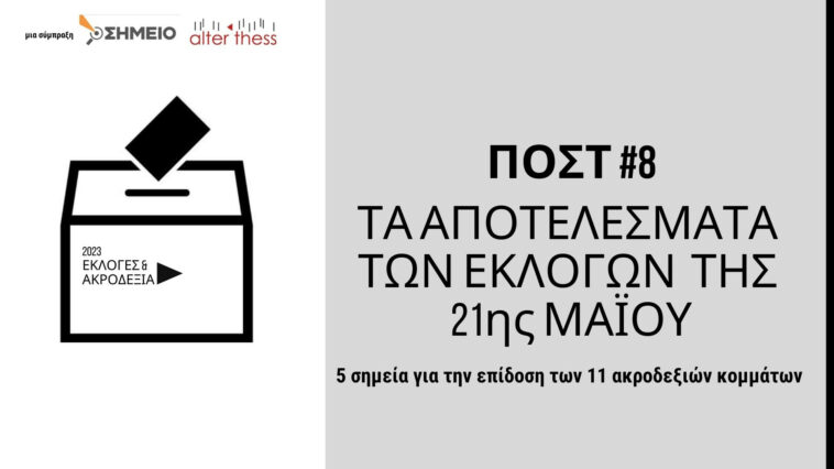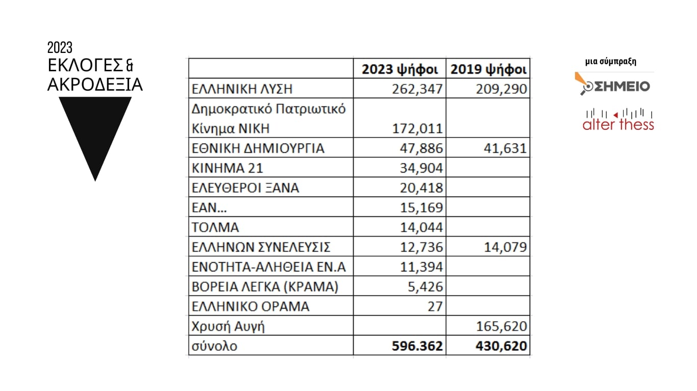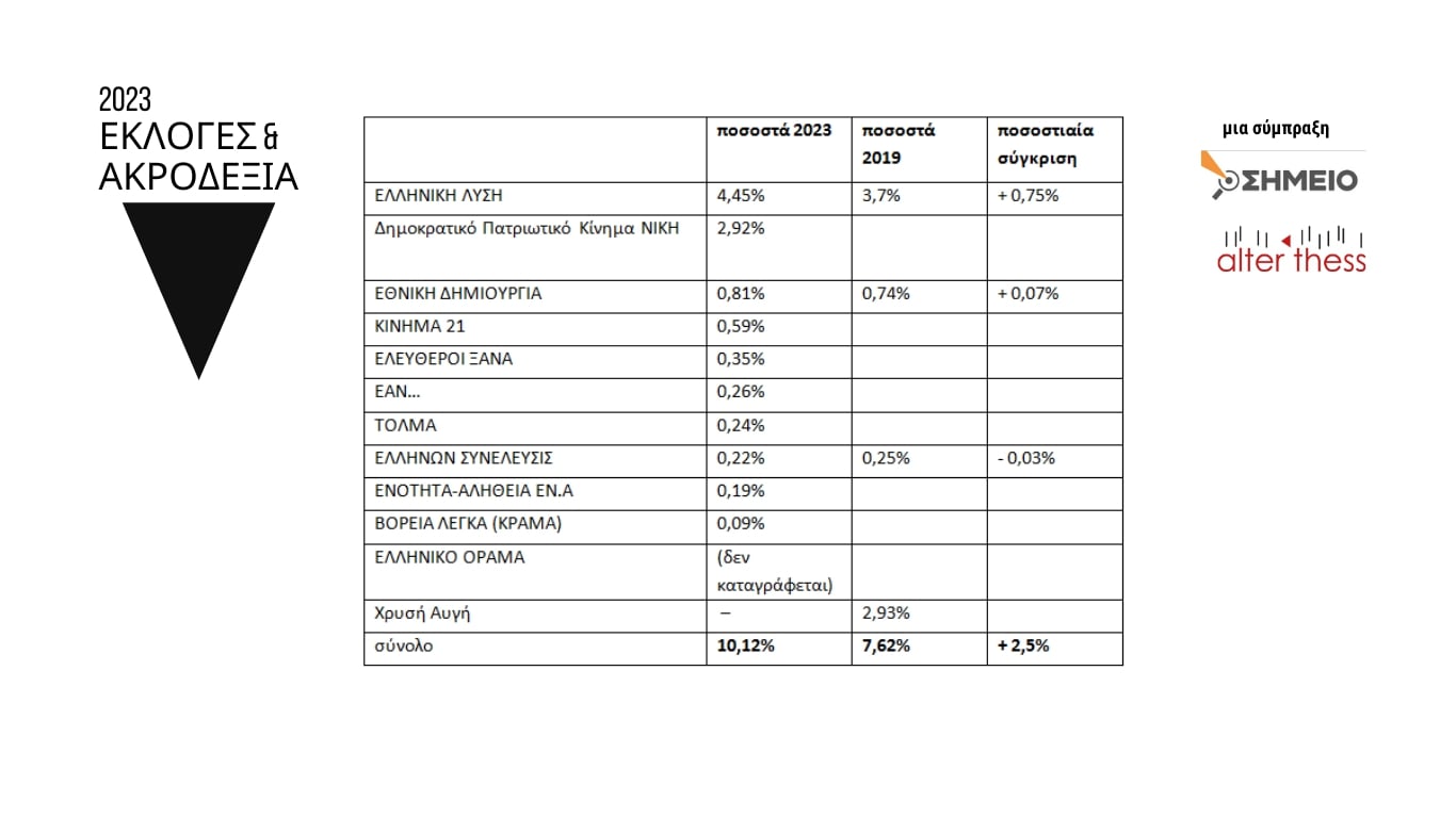 Το συνολικό ποσοστό της ακροδεξιάς ψήφου είναι κατά 2,5% υψηλότερο από το 2019. Οι ψήφοι είναι κατακερματισμένες, ωστόσο η Ελληνική Λύση αύξησε το ποσοστό της και την κοινοβουλευτική της εκπροσώπηση, ενώ η νεοσύστατη ΝΙΚΗ έχασε την είσοδο στη Βουλή για 0,08 μονάδες, και έτσι την διεκδικεί από προνομιακή θέση στις εκλογές της 25ης Ιουνίου.